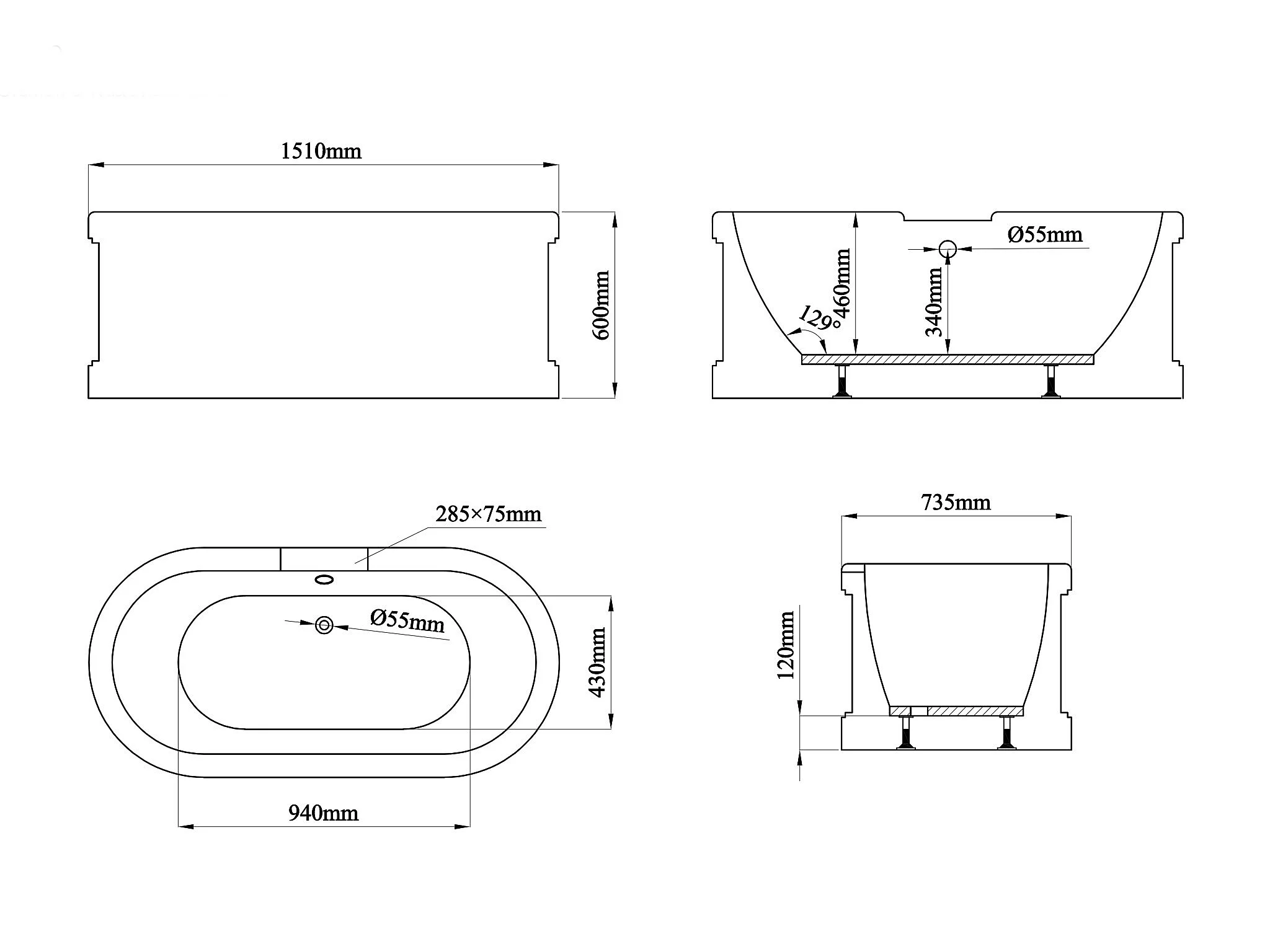 Baignoire îlot style campagne chic - Gris mat - 161L - 152 x 74 x 60 cm - CAVASO