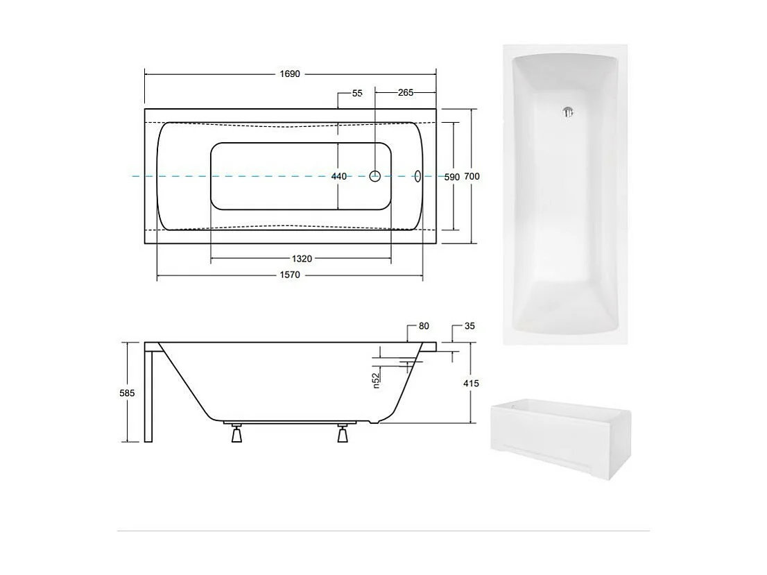 Baignoire MIRANO II avec tablier 140-150-160-170 x 70 - Dimensions: 170 x 70 cm