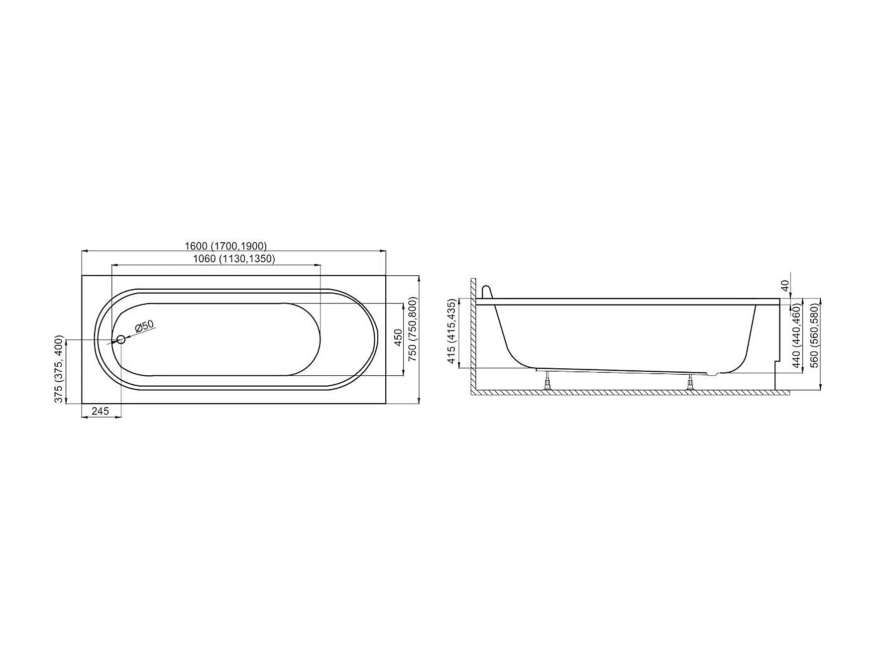 Baignoire rectangulaire 160x75 MEDIUM acrylique blanc, sans Habillage + Pieds + Vidage à chromé