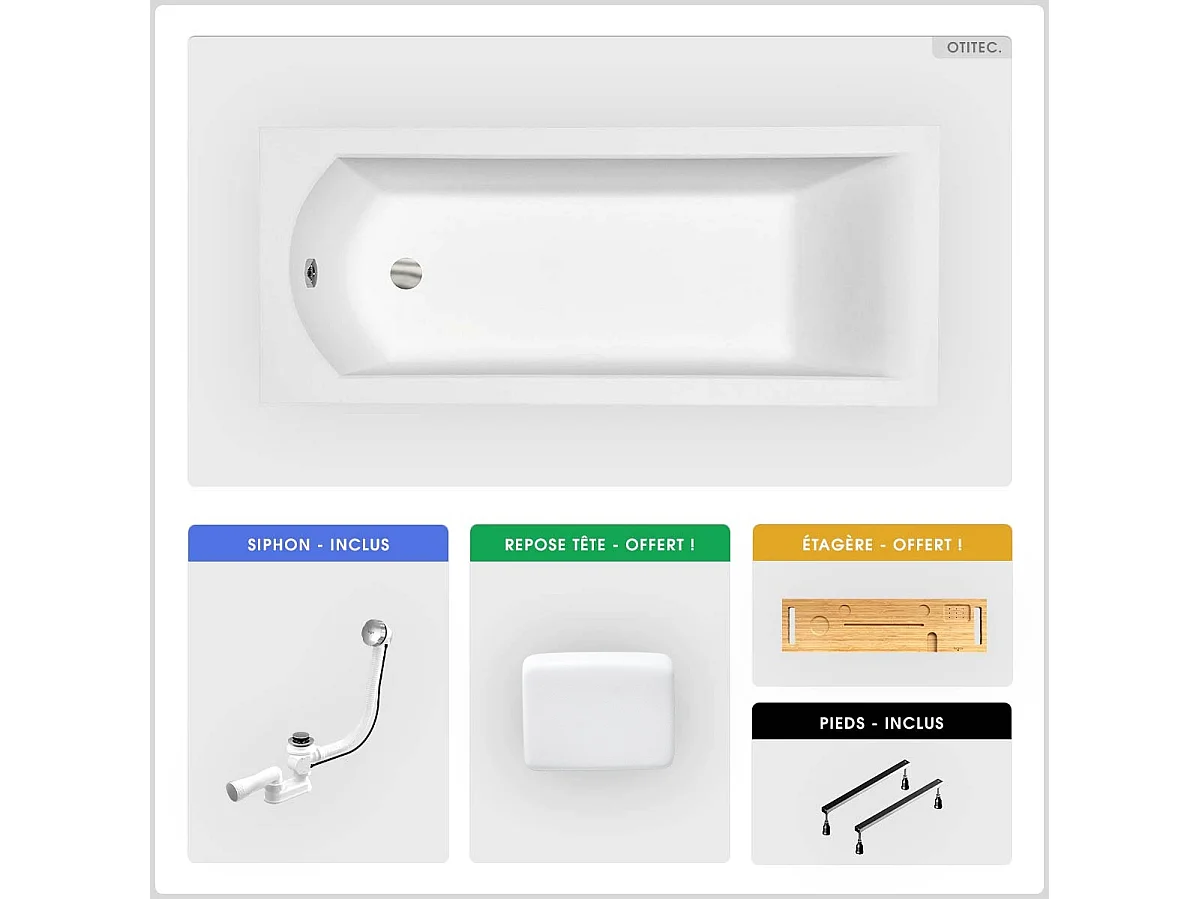 Baignoire rectangulaire - 180 x 80 cm - sans Habillage - avec Pieds - Repose-tête - Étagère bambou - Vidage Chrome - SHEA