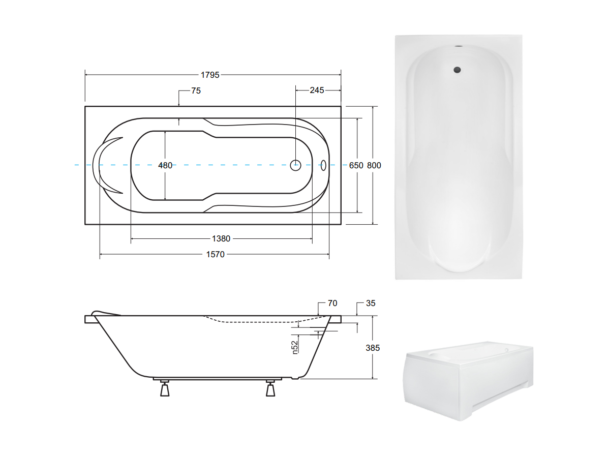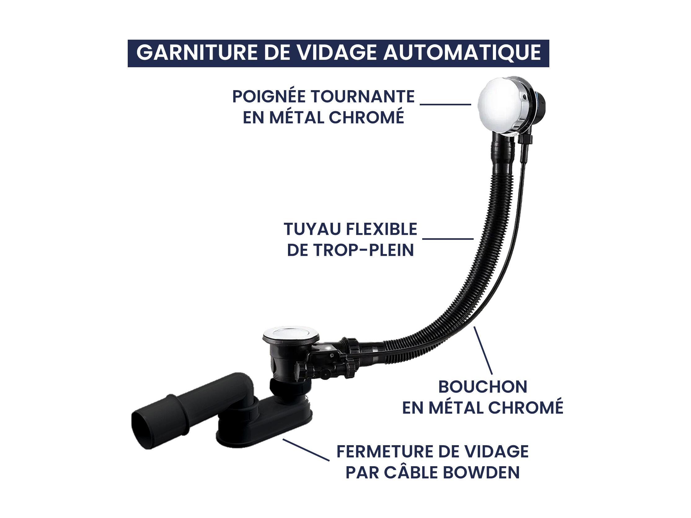 Baignoire rectangulaire 180x80 BONA acrylique blanc + avec Tablier + Pieds + Vidage à chromé