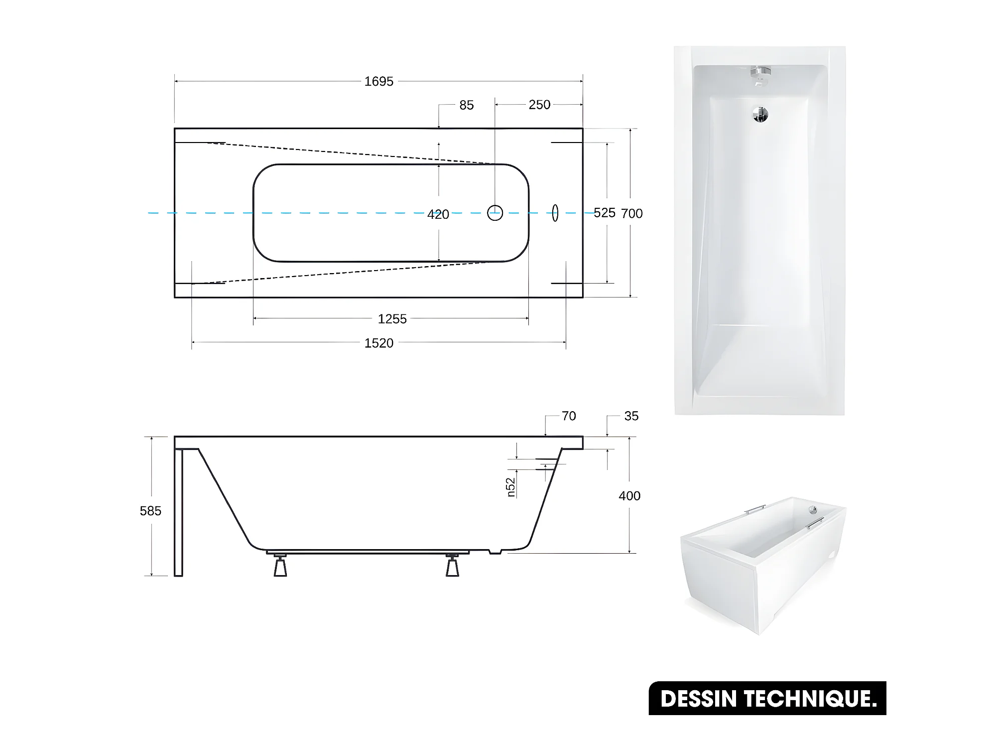 Baignoire rectangulaire - avec Tablier Blanc et Repose Tête OFFERT | MODERN | 170 x 70 cm