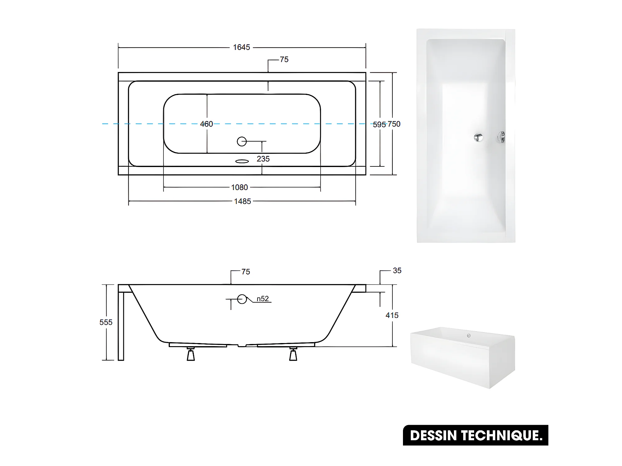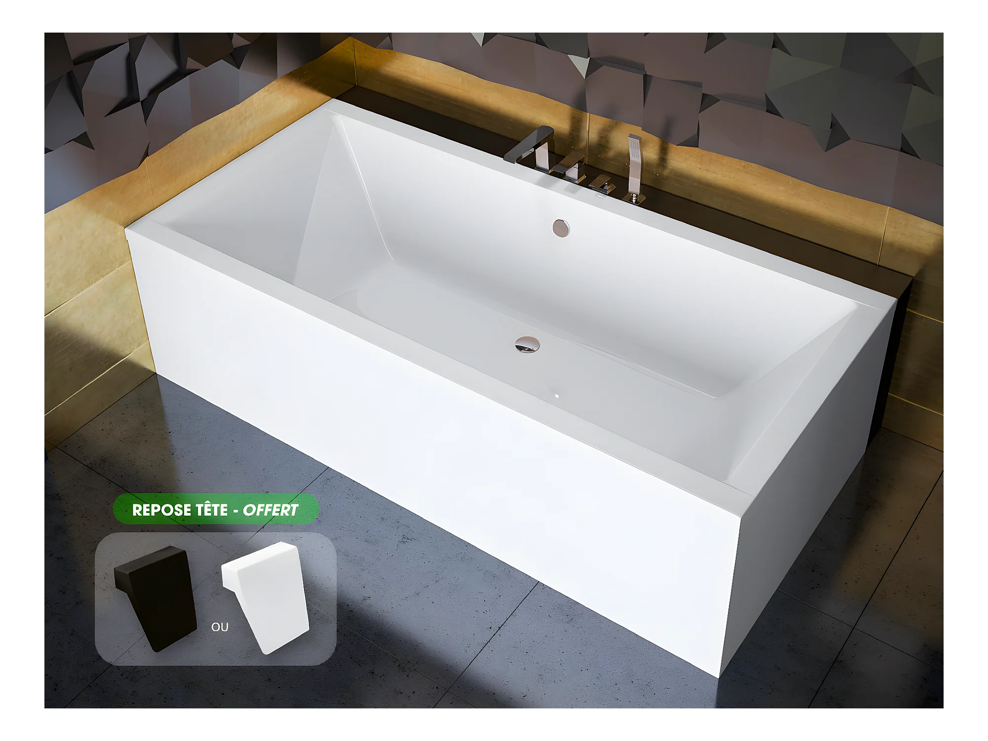 Baignoire rectangulaire - avec Tablier Blanc et Repose Tête OFFERT | QUADRO | 165 x75 cm