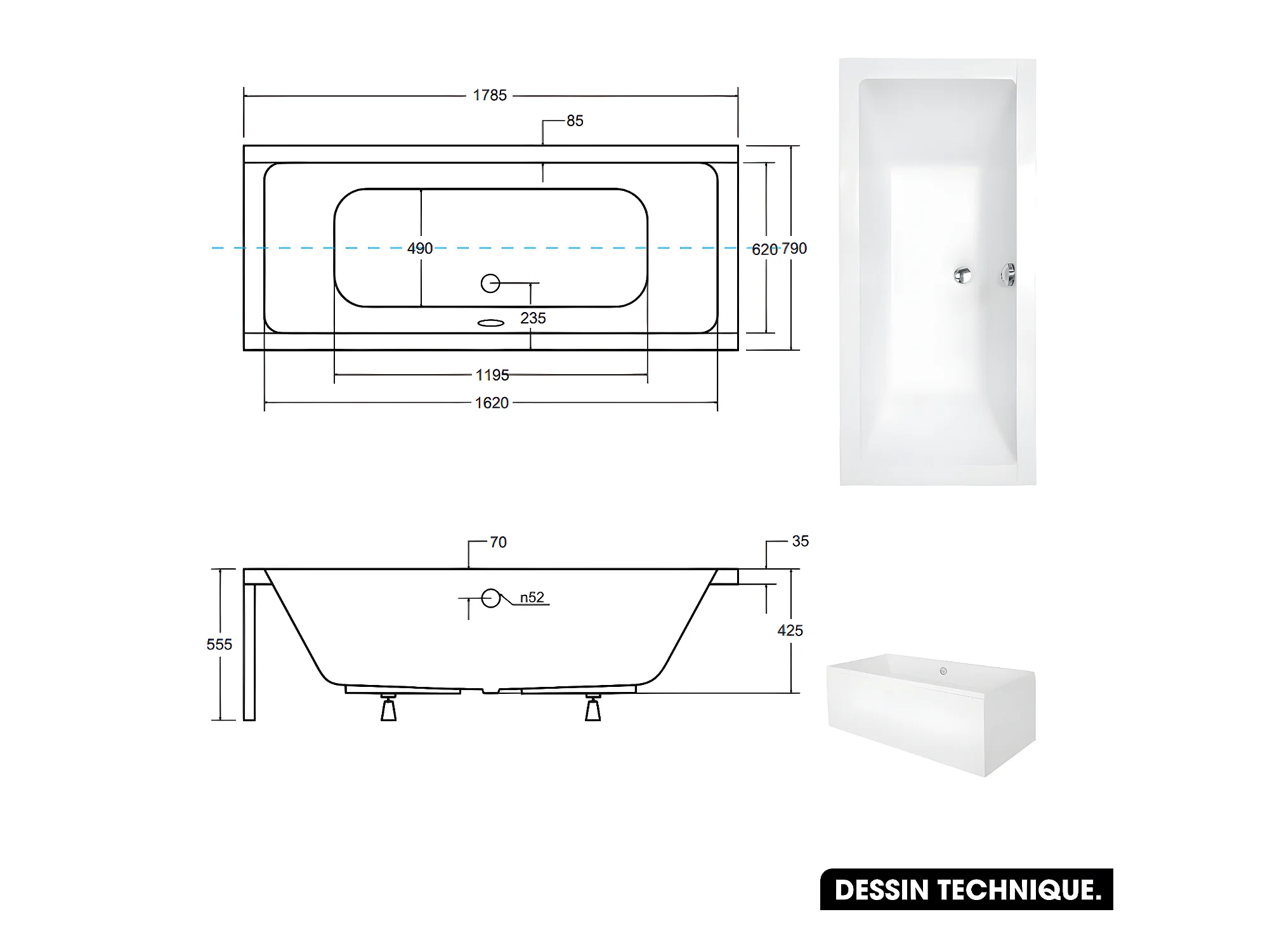 Baignoire rectangulaire - avec Tablier Noir Mat et Repose Tête OFFERT | QUADRO | 180 x 80 cm