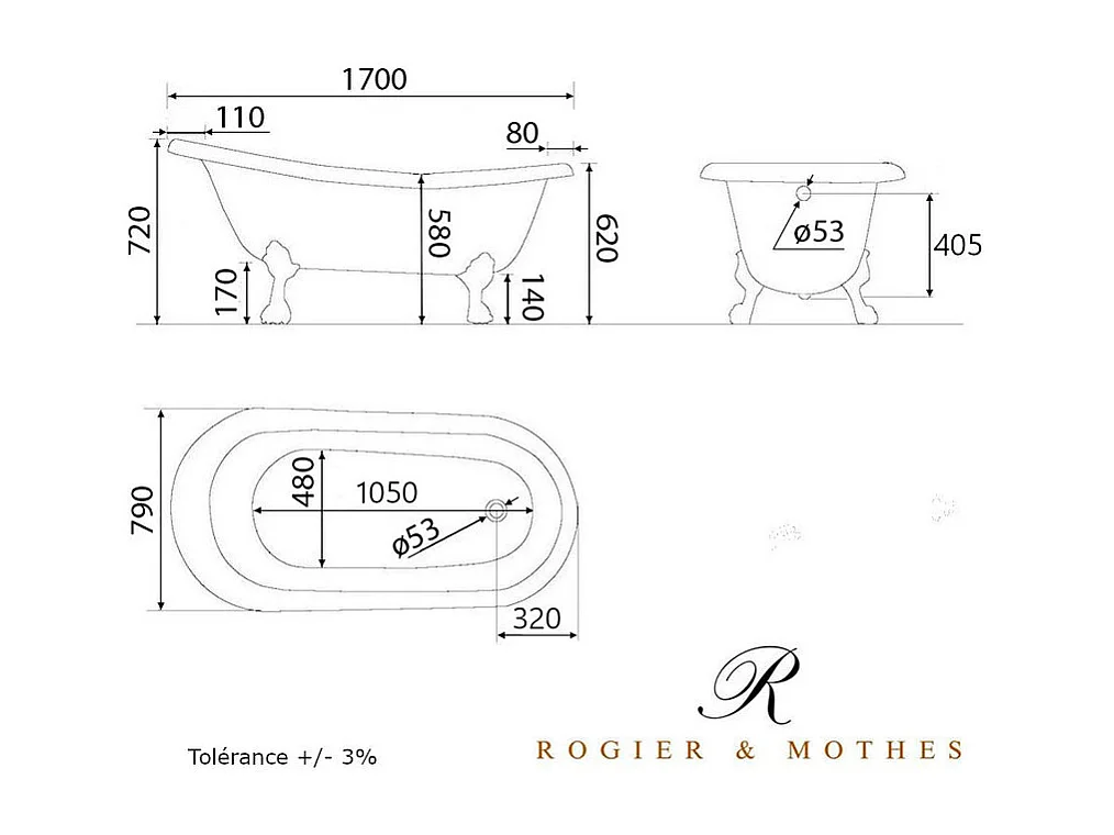Baignoire sur pieds en fonte LIVINGSTON Noire 170 cm Pieds blancs