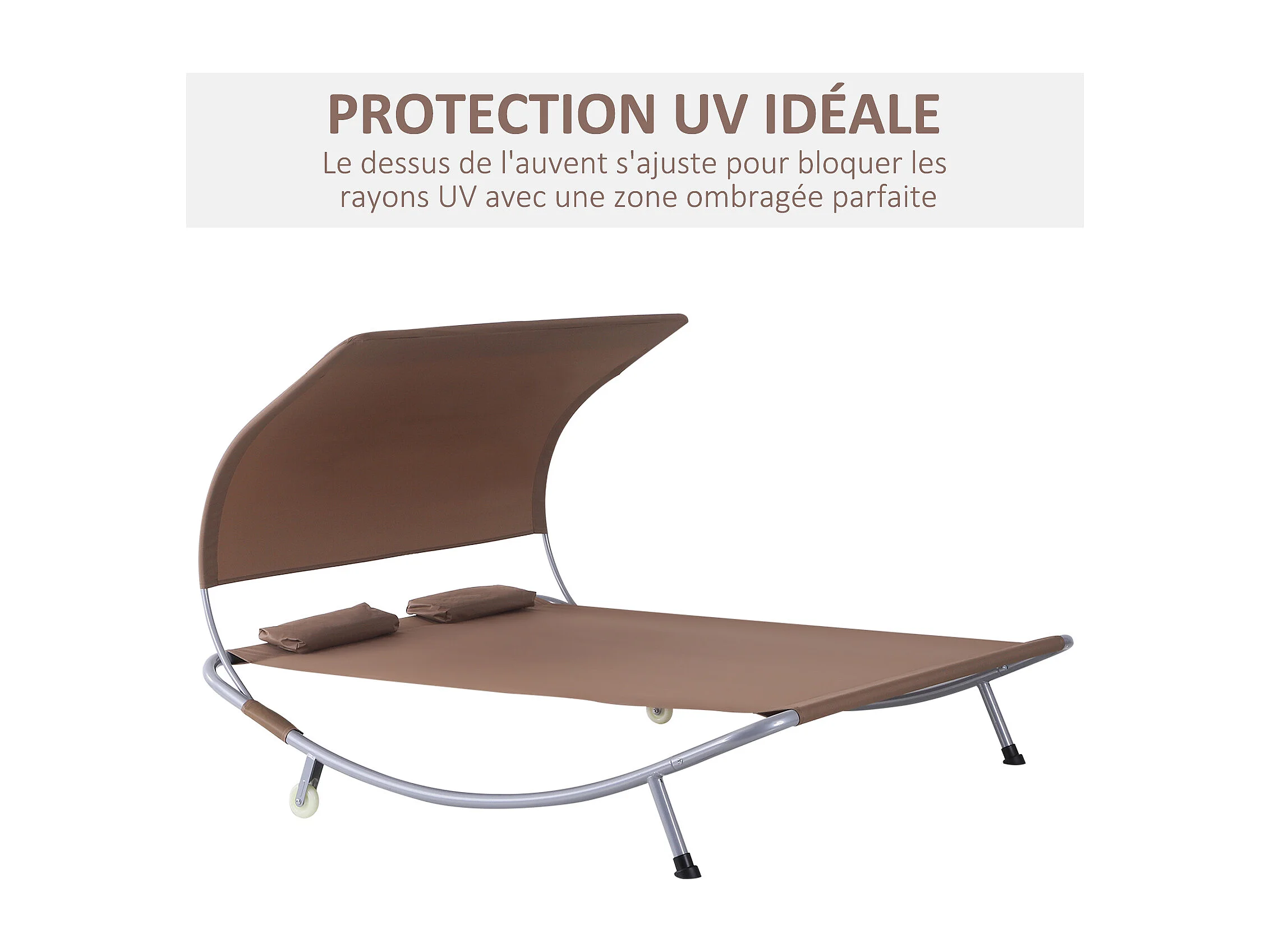Bain de soleil 2 places lit de jardin design contemporain toit réglable 2 roulettes 2 oreillers acier époxy polyester marron