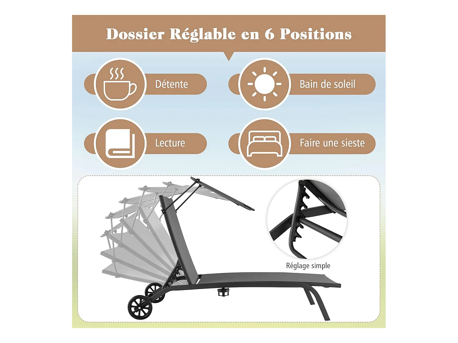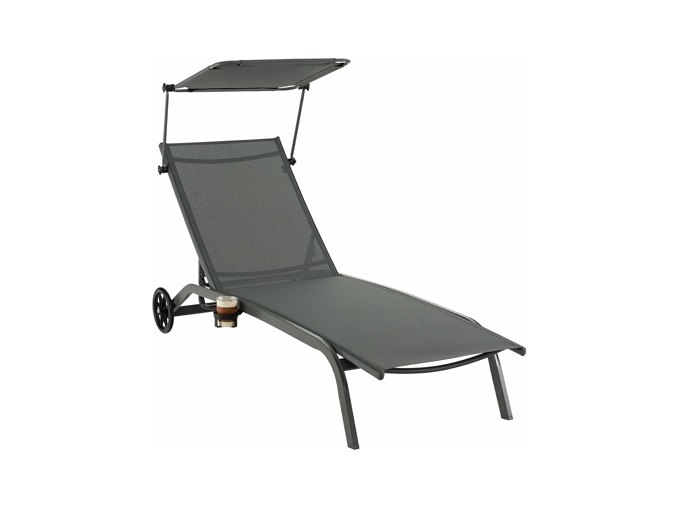 Bain de Soleil Inclinable à Dossier 6 Niveaux, Transat Jardin Exterieur avec Roues, Auvent Réglable, Porte-Gobelet, Charge 150 KG, pour Piscine Plage Balcon
