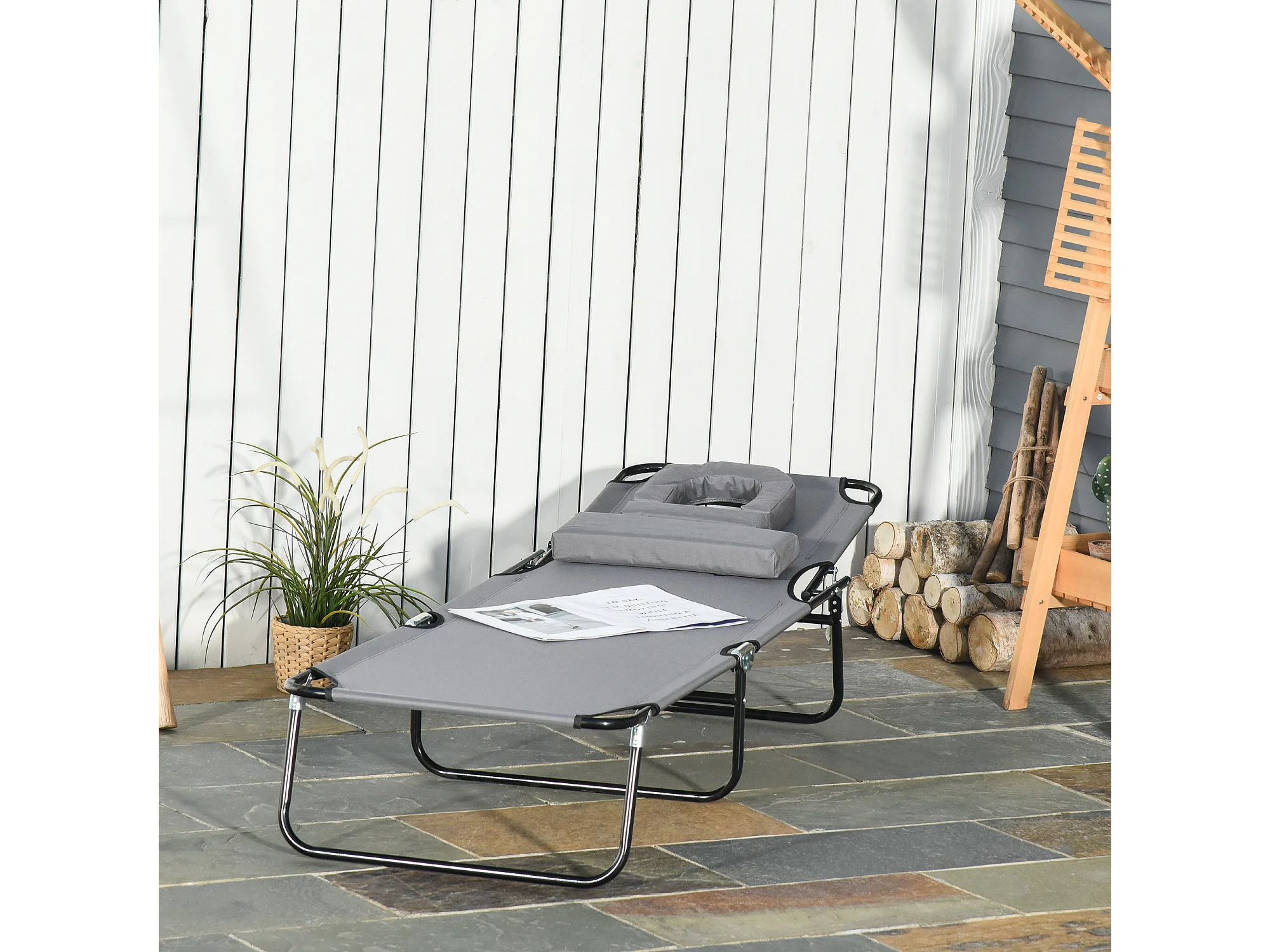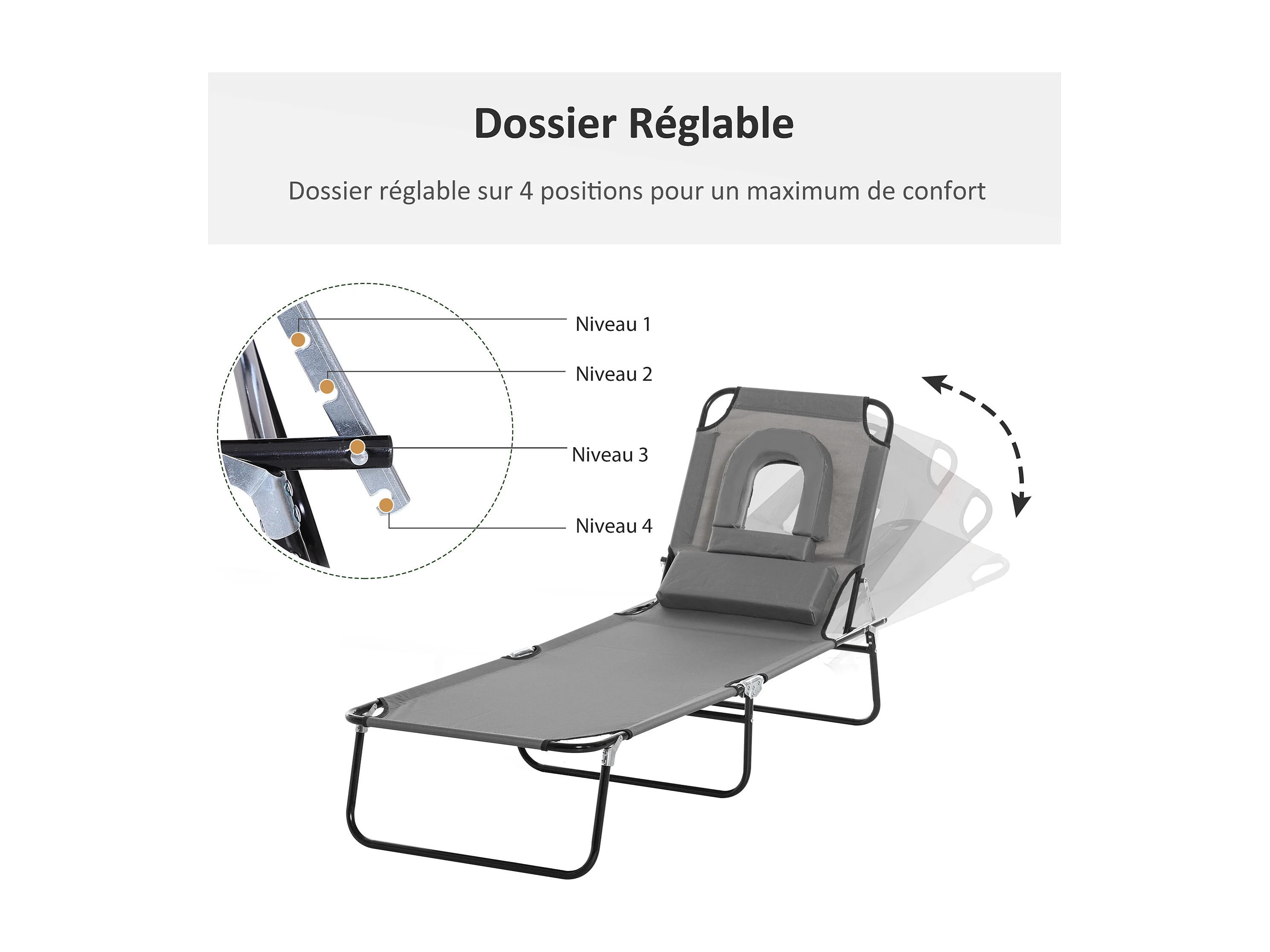 Bain de soleil pliable transat inclinable 4 positions chaise longue de lecture 3 coussins fournis gris
