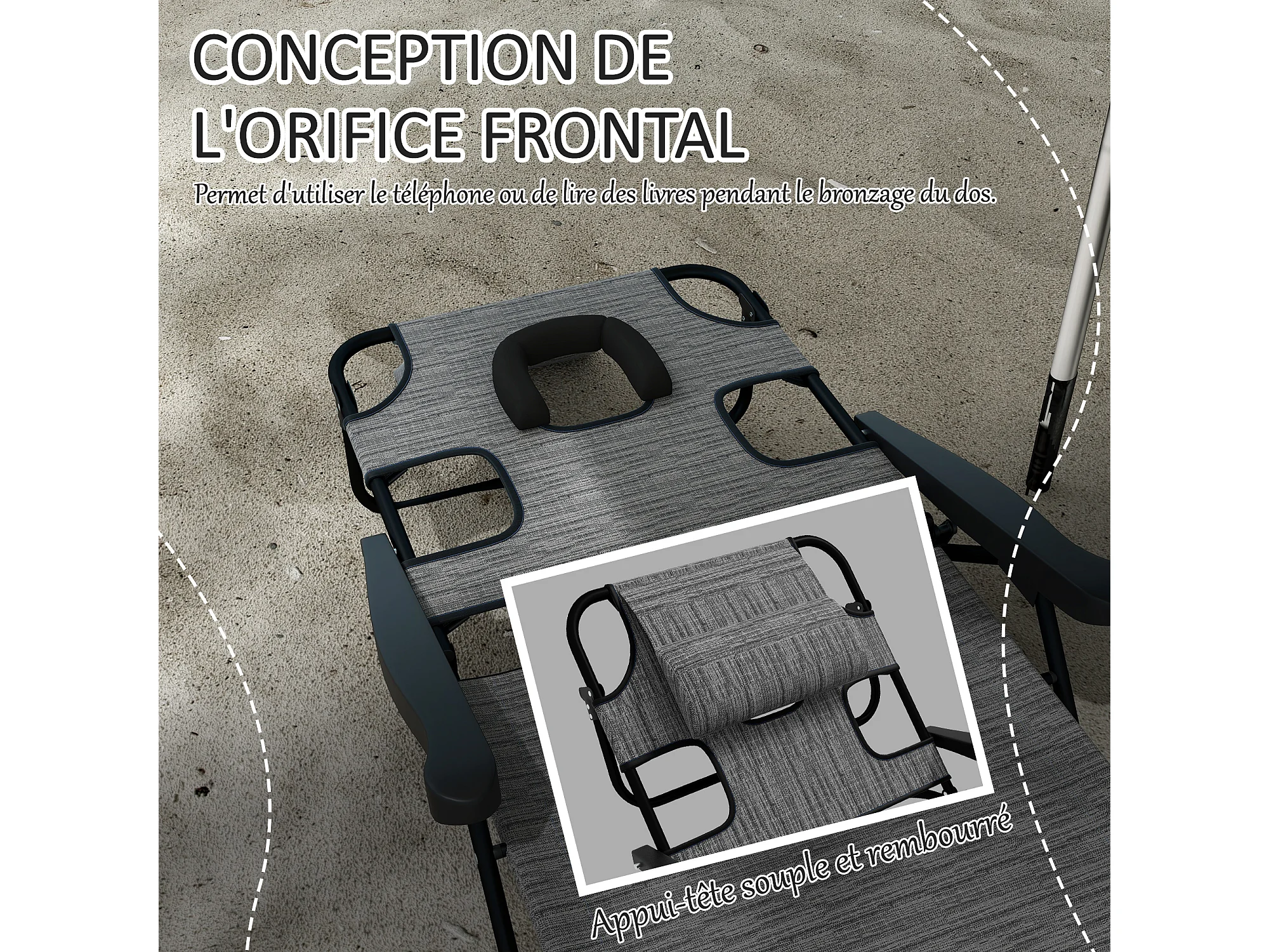 Bain de soleil transat pliable inclinable - coussins, espace tête - acier noir polyester gris chiné