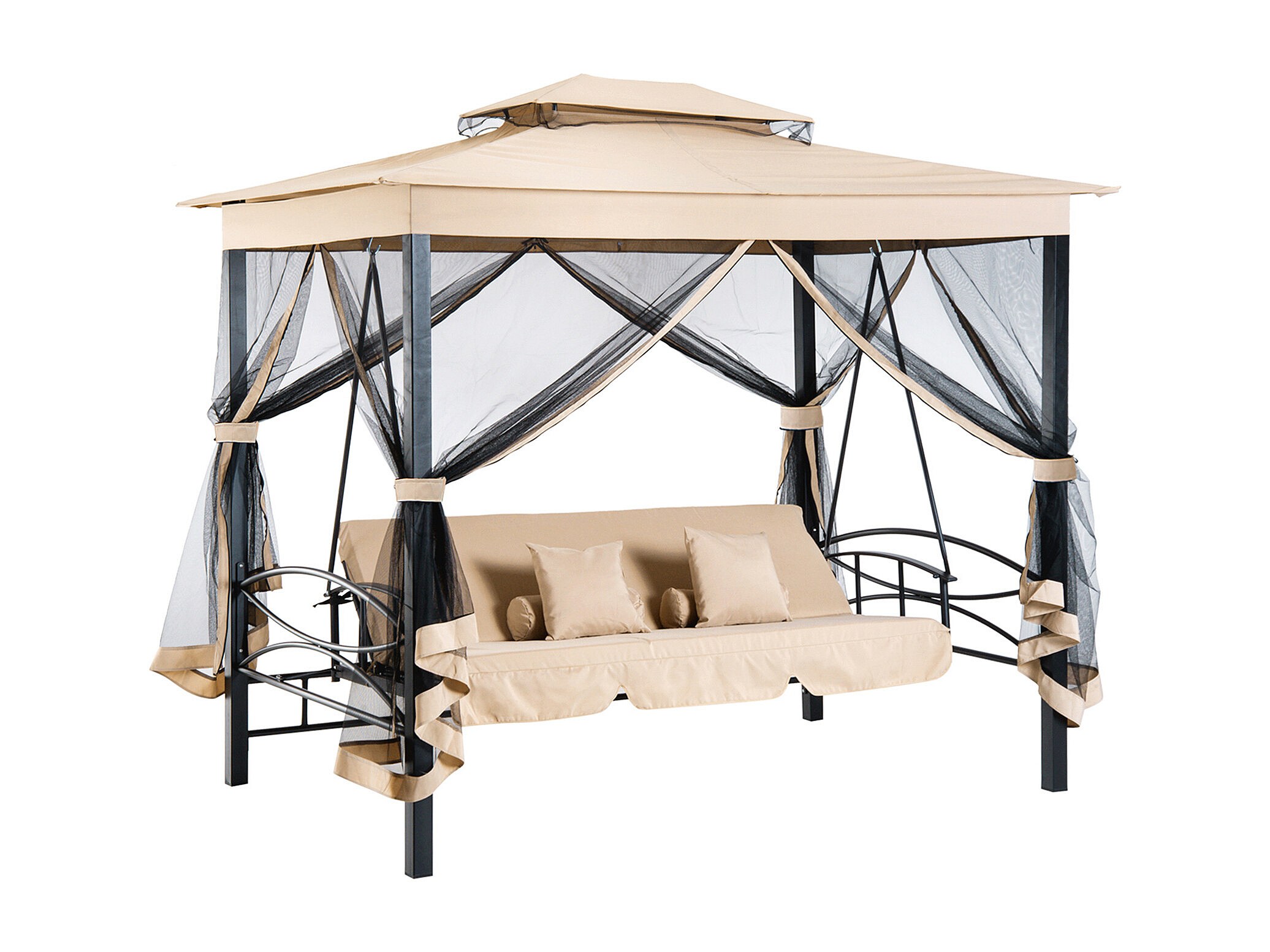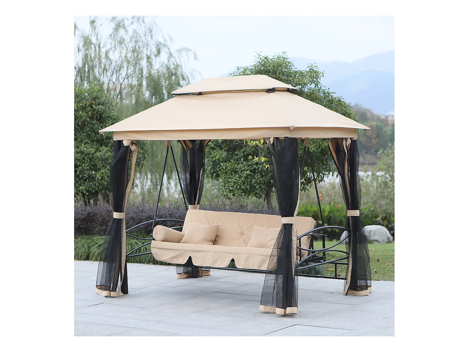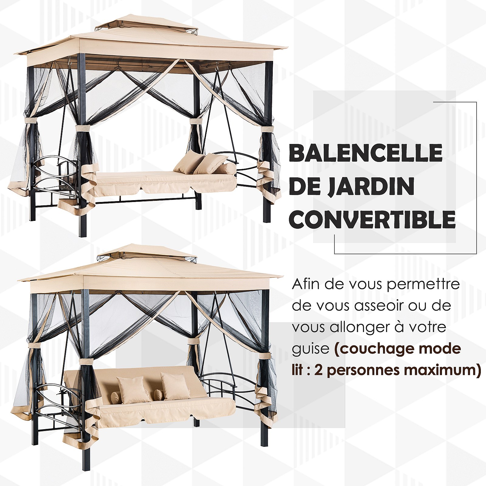 Balancelle de jardin 3 places convertible style colonial grand confort 5 coussins + matelas + moustiquaires inclus 2,56L x 1,72l x 2,48H m marron clair