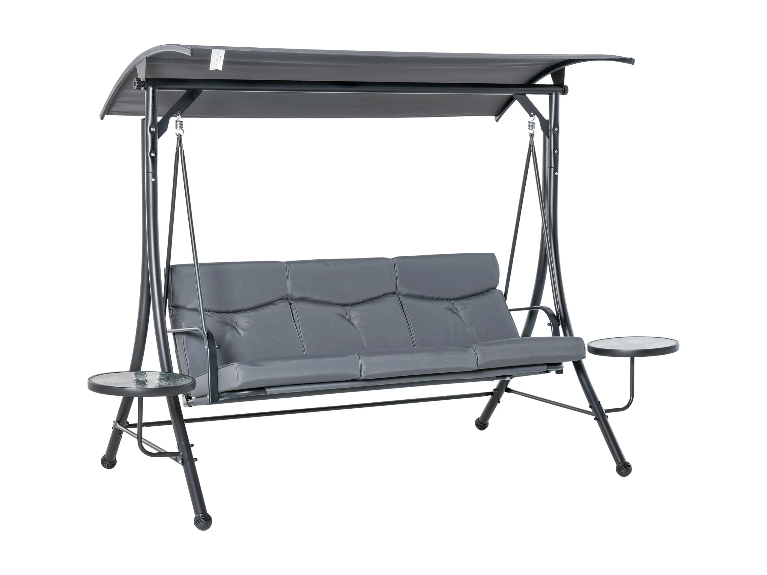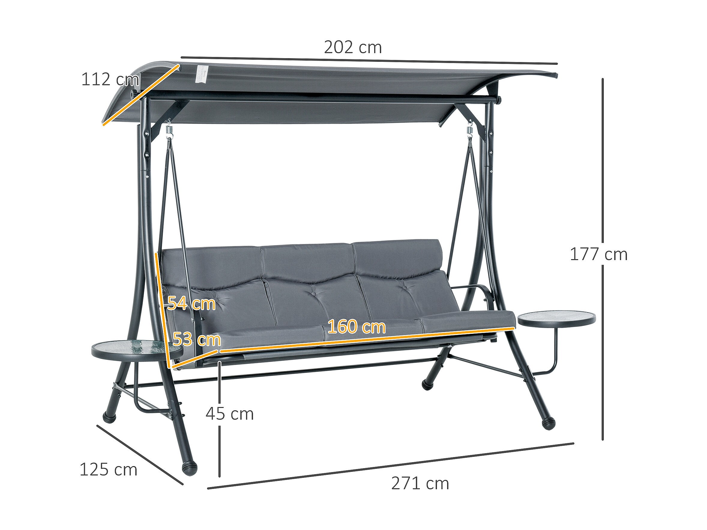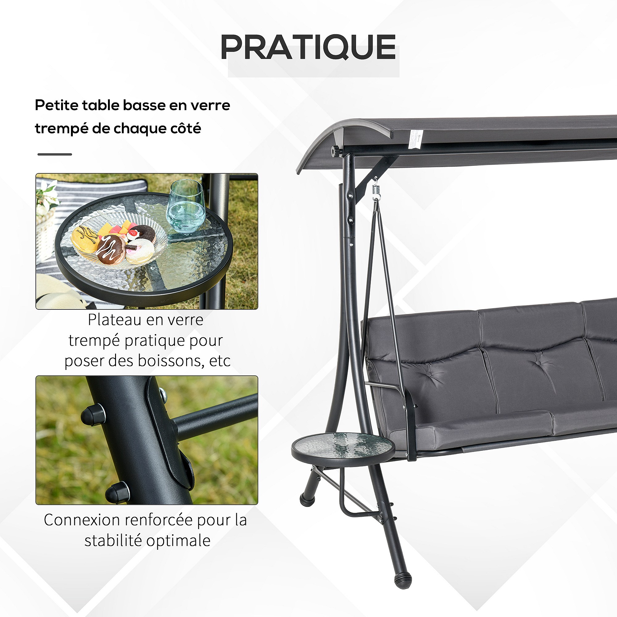 Balancelle de jardin 3 places grand confort toit inclinaison réglable épais coussins amovibles 2 tablettes polyester métal époxy gris