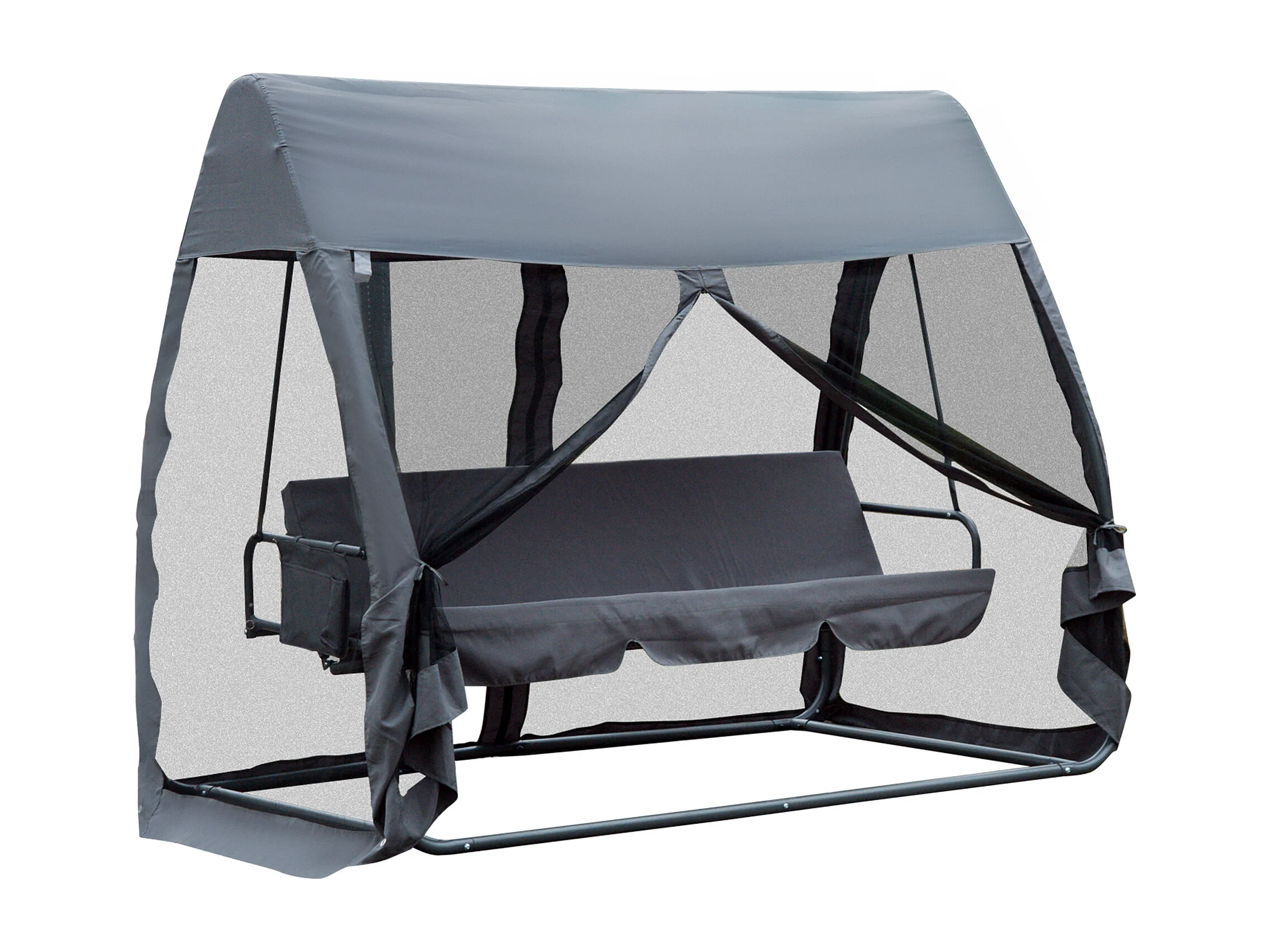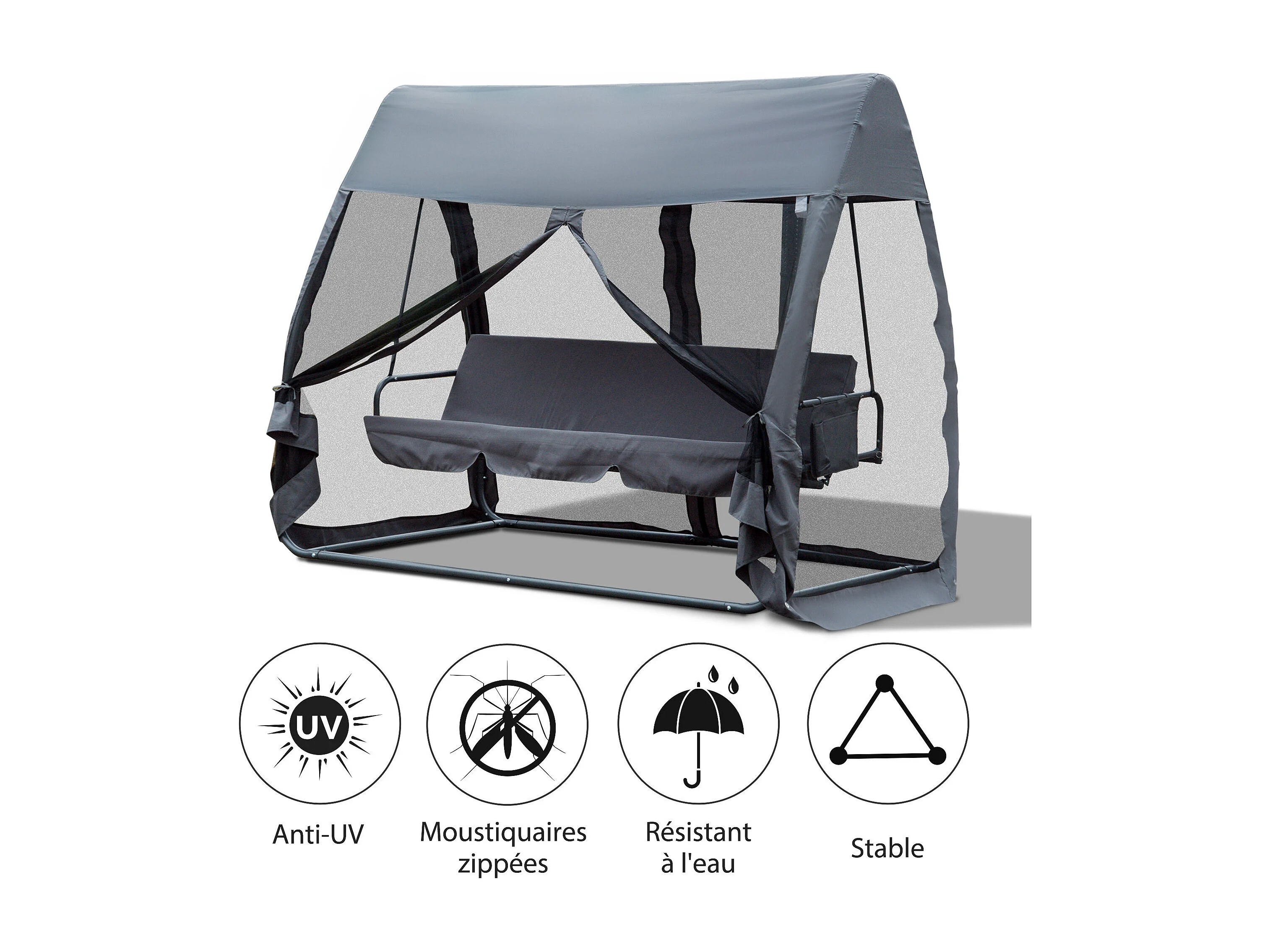 Balancelle de jardin convertible 3 places grand confort : matelas assise dossier, moustiquaire intégrale zippée avec toit, pochette rangement métal époxy polyester