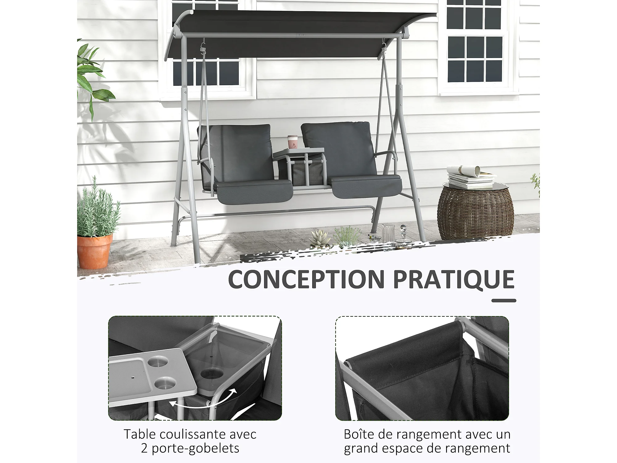 Balancelle design de jardin 2 places inclinaison toit réglable tablette porte-gobelet rangement métal gris