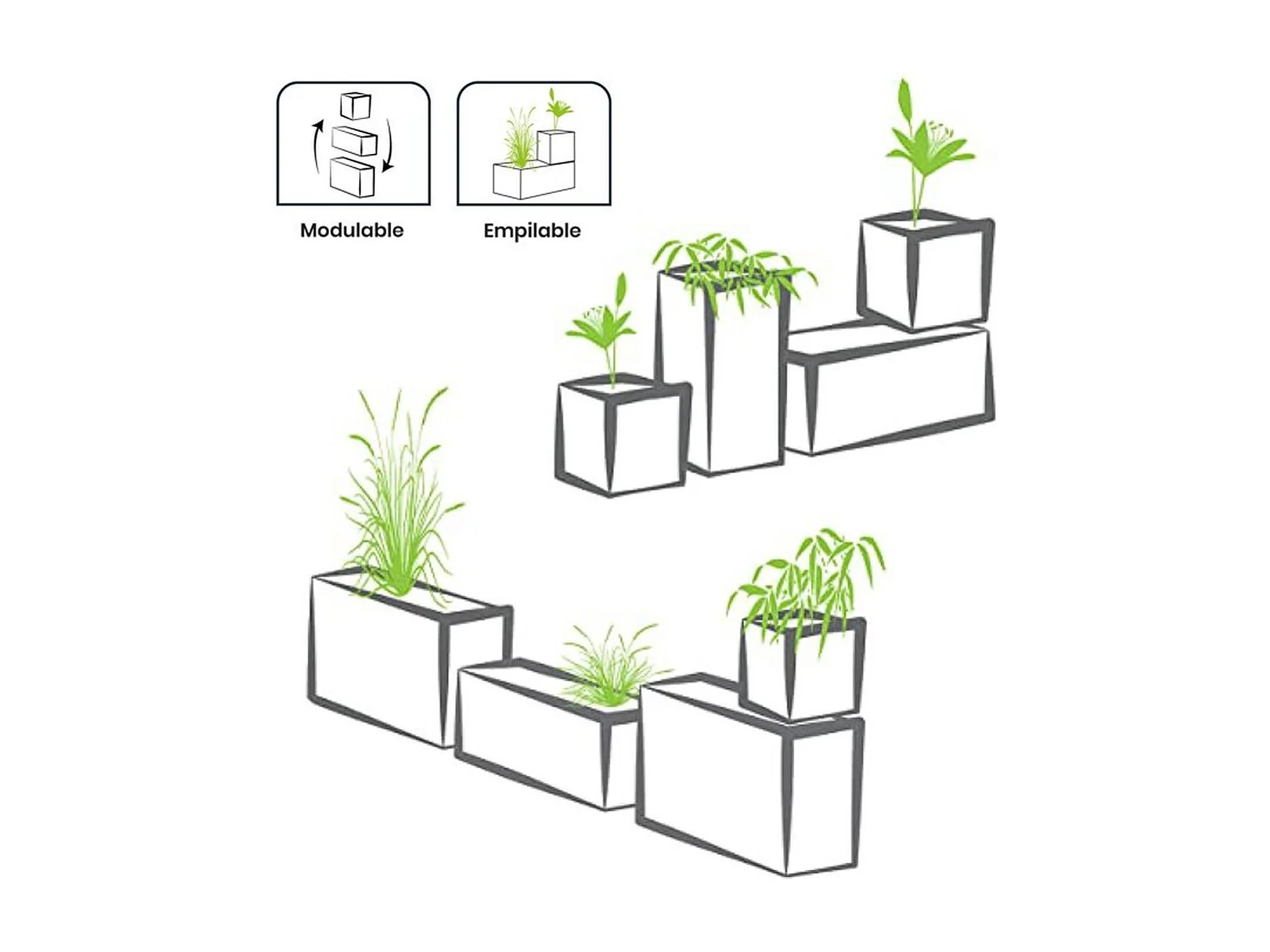 Set de 5 pots de fleurs empilables, plastique, résistant aux intempéries, gris (59x21x16 cm)