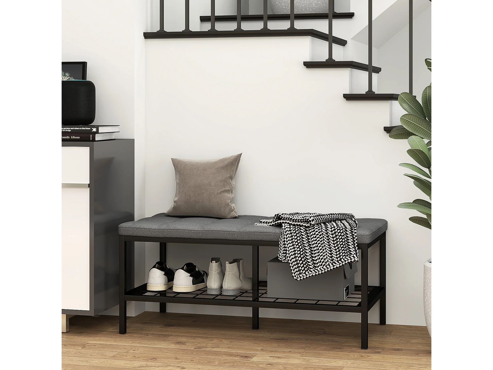 Banc à chaussures avec coussin effet capitonné - étagère - dim. 90 x 41 x 40 cm - métal noir tissu gris