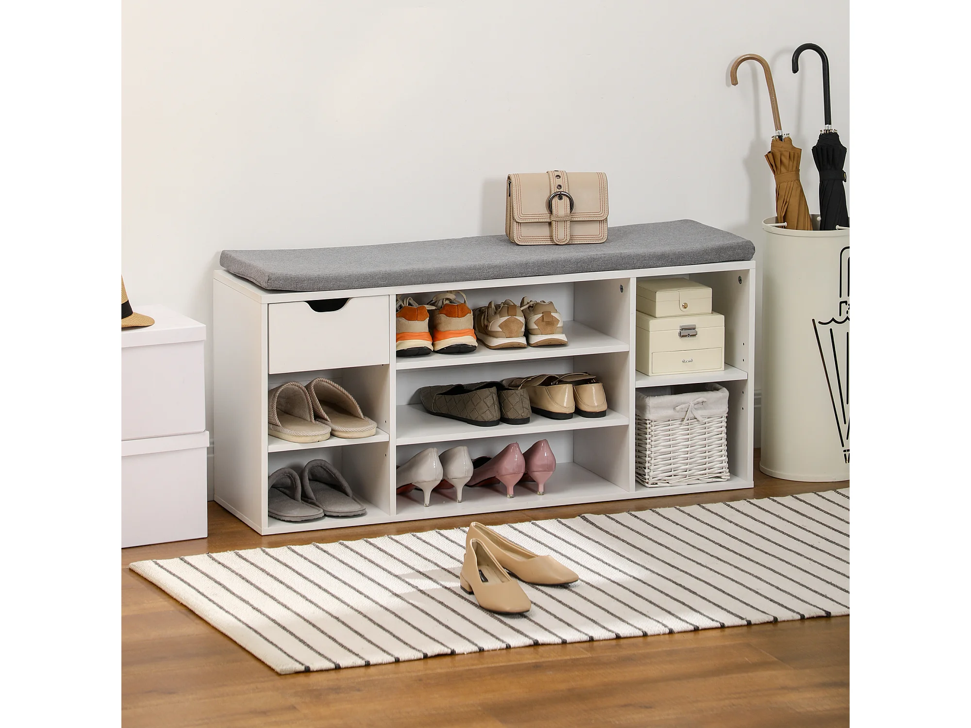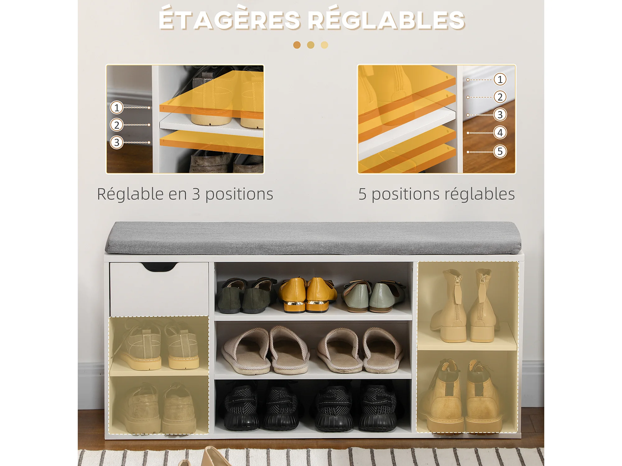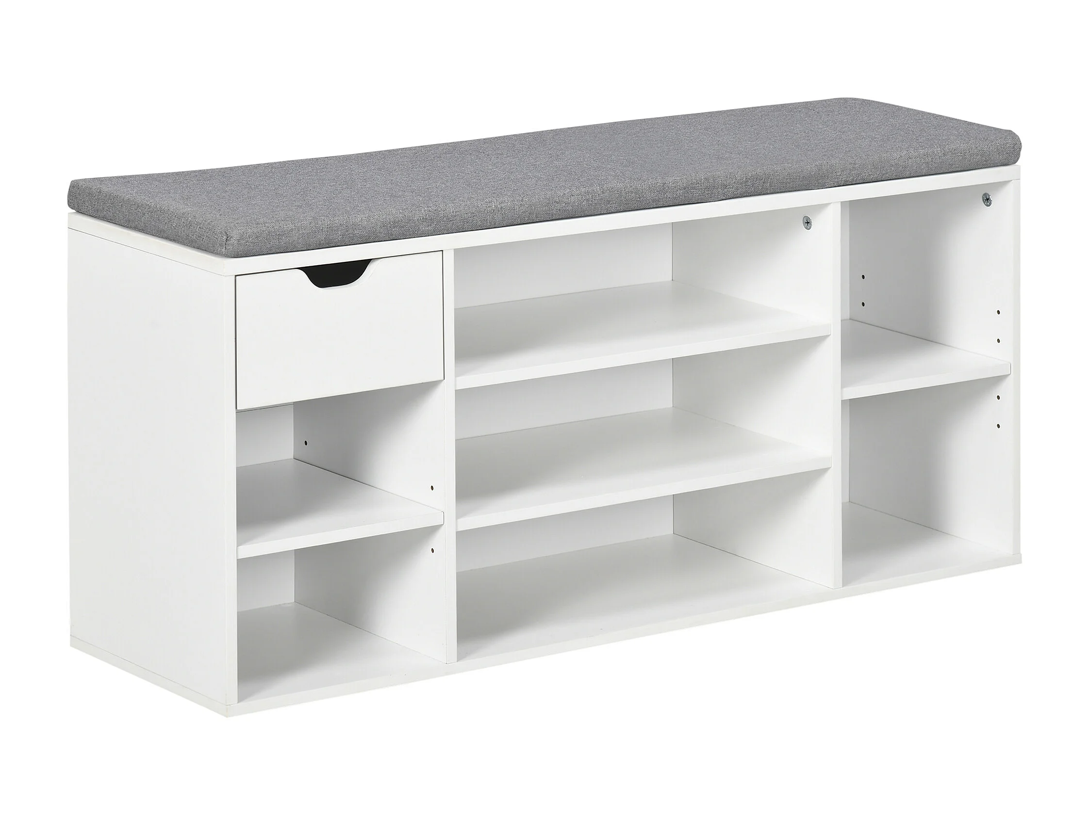 Banc à chaussures avec coussin gris - 2 étagères réglables, 7 compartiments, tiroir - blanc