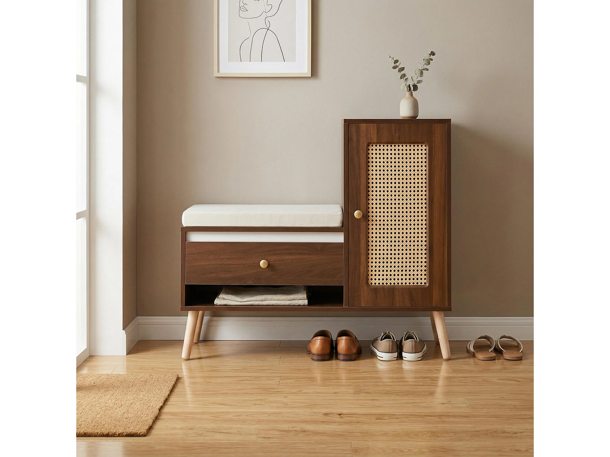 Banc à chaussures effet noyer en rotin avec coussin beige 95,5x35x80,5cm