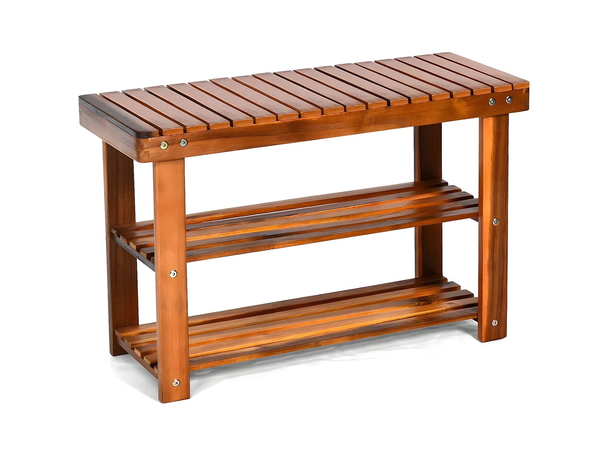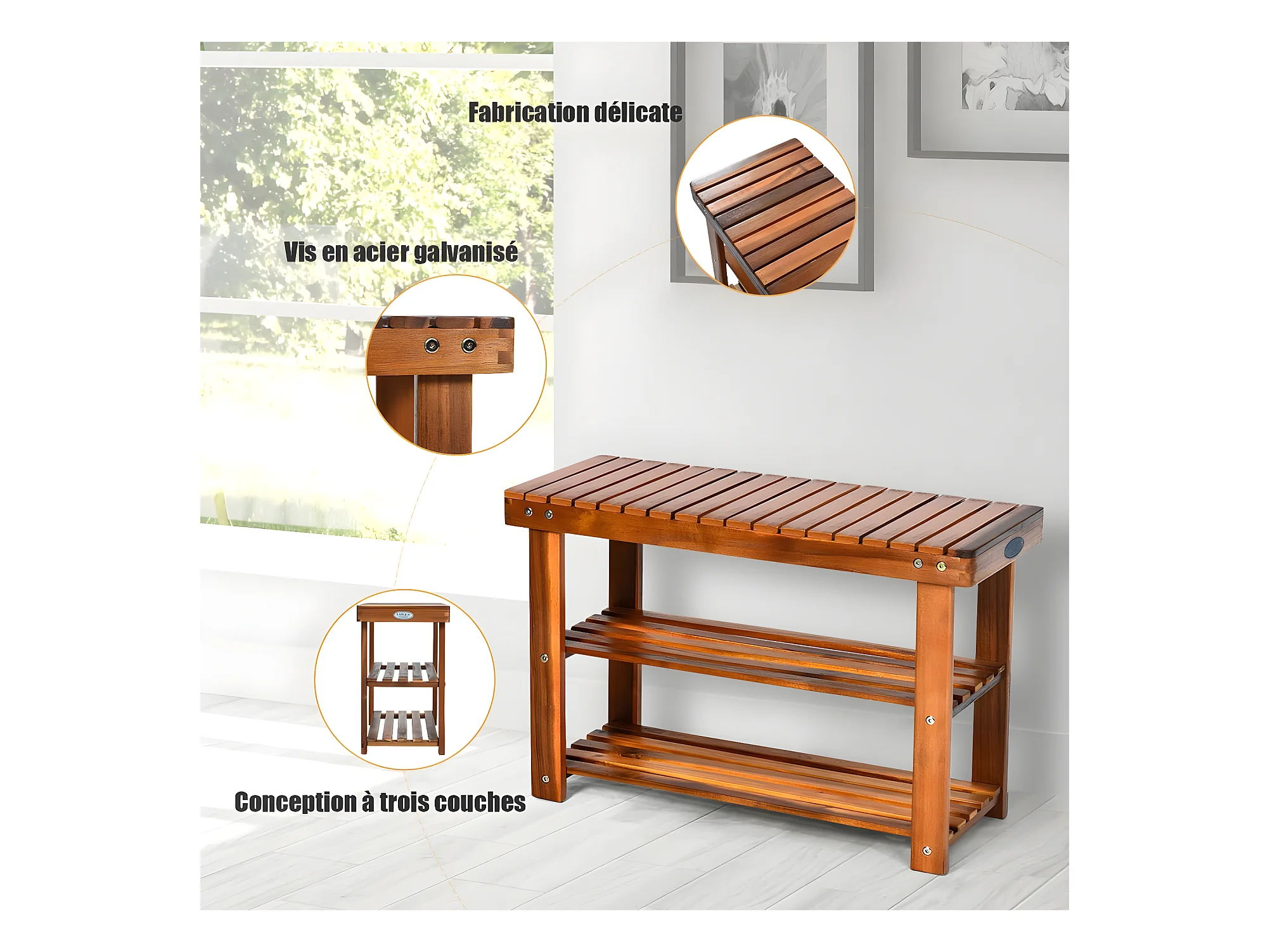 Banc à Chaussures en Bois d'Acacia, Étagère de Rangement à 3 Niveaux, Charge 180 kg, pour l’Entrée, Salon, Salle de Bain, Couloir, 28 x 70 x 45 cm, Roux