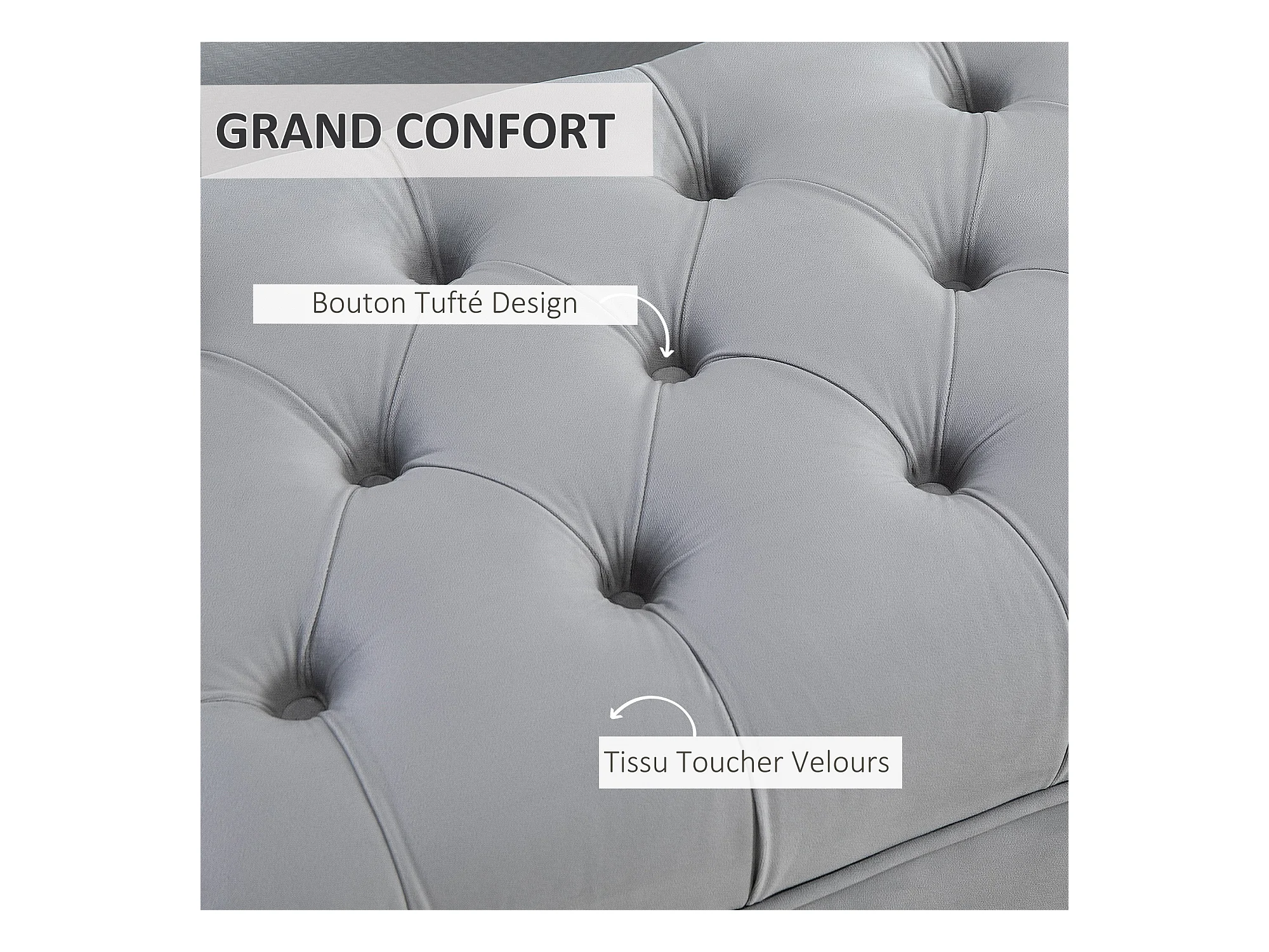 Banquette coffre de rangement 2 en 1 design Chesterfield accoudoirs courbés capitonnés piètement bois noir aspect lin gris