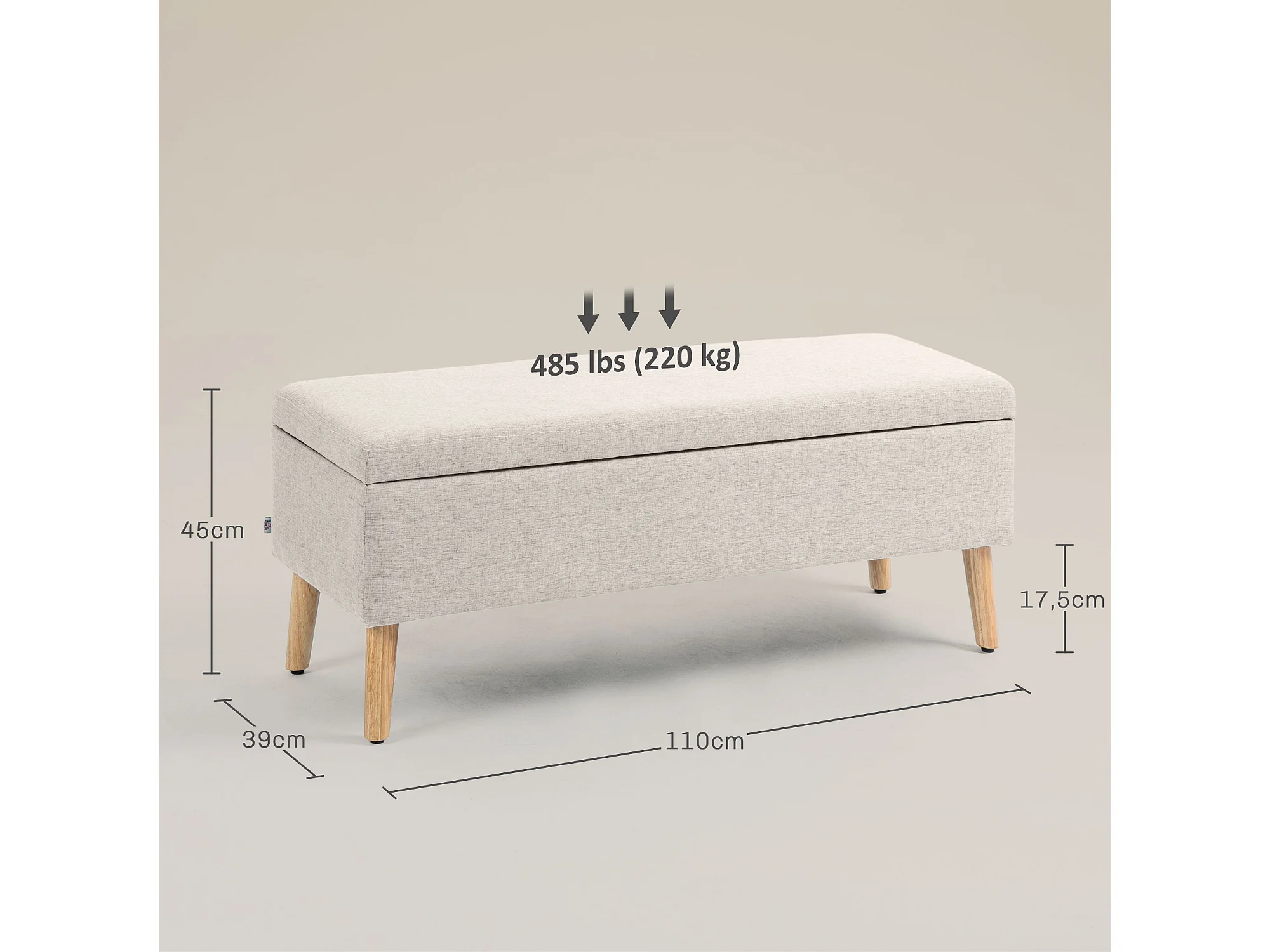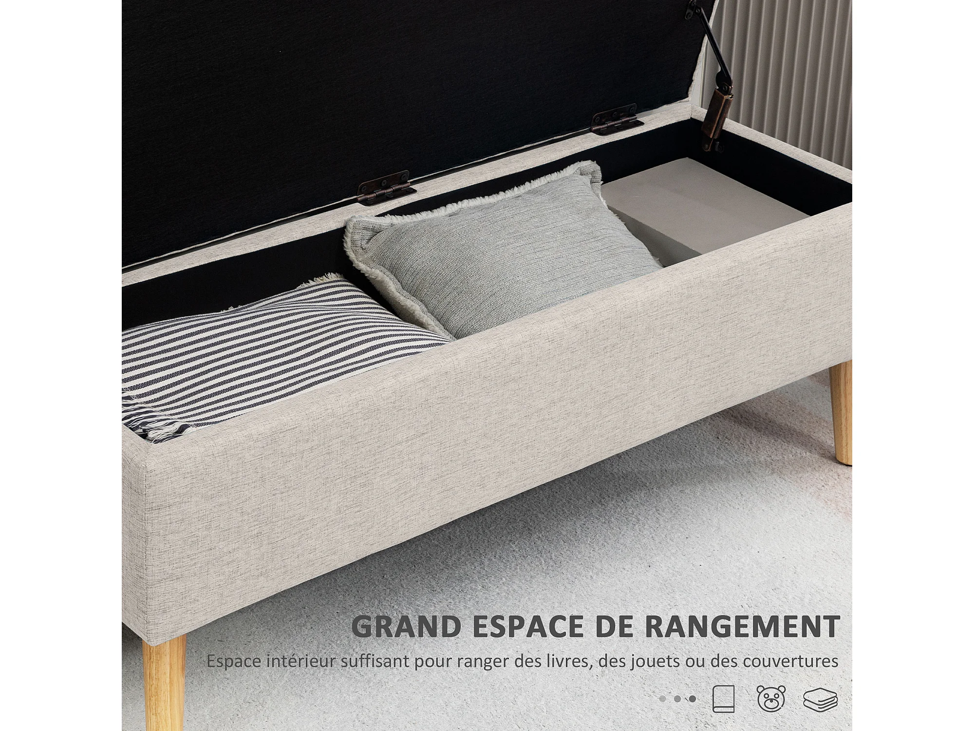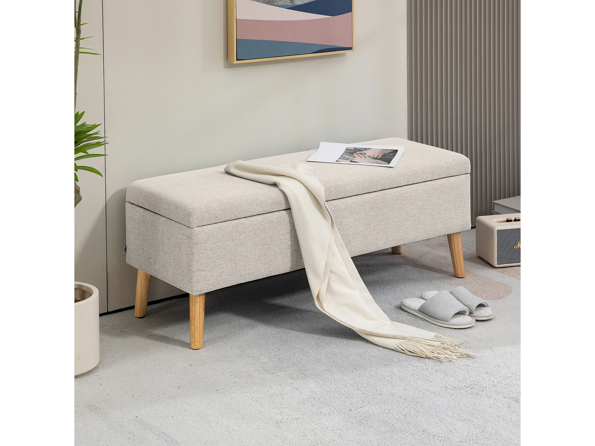 Banc coffre de rangement style scandinave piètement éffilé incliné bois hévéa tissu beige