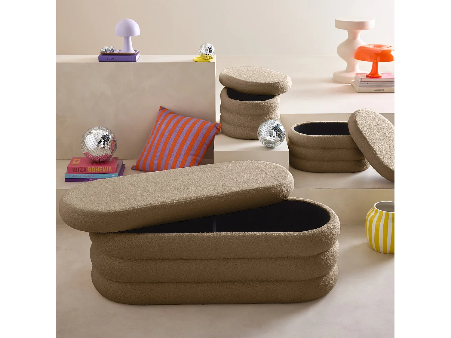 Banc coffre en bouclettes taupe avec 2 poufs ovales de rangement intégrés - L111cm