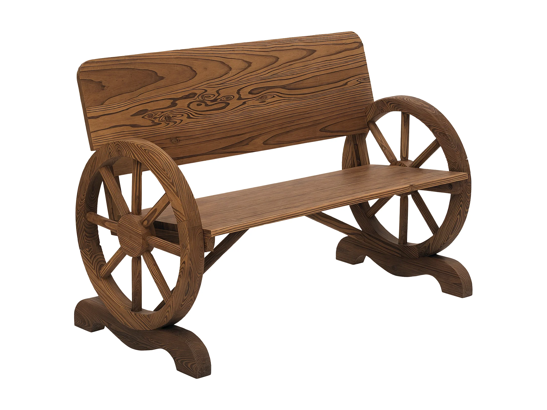 Banc de jardin 3 places style rustique chic accoudoirs roues de charette bois sapin traité carbonisation