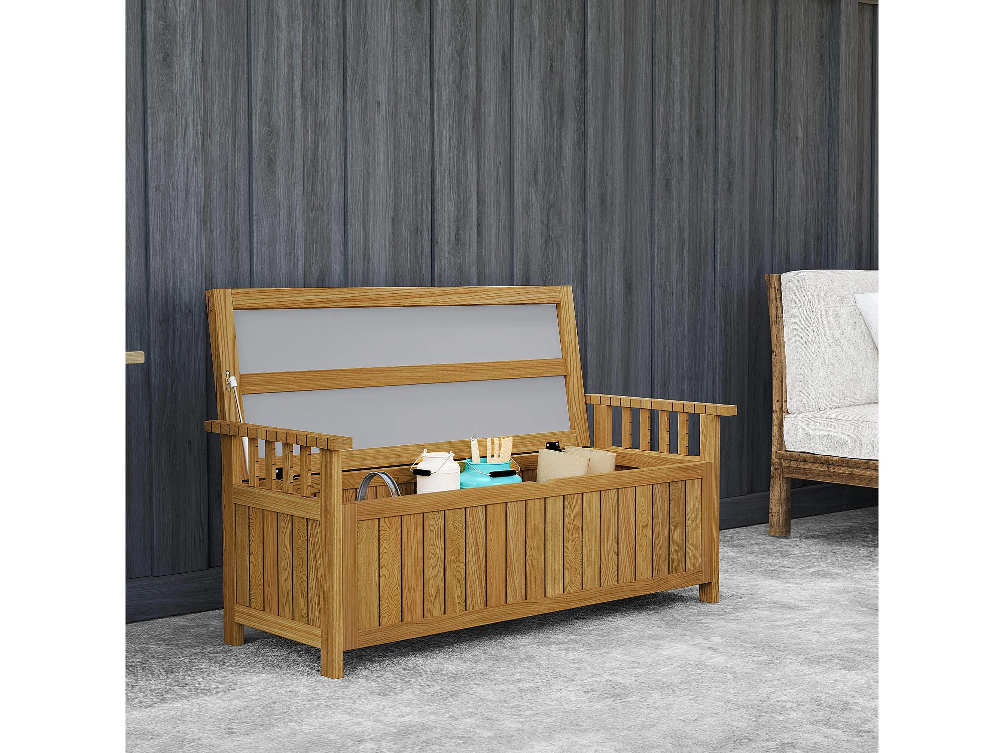 Banc de jardin avec coffre de rangement 186L - accoudoirs - dim. 128 x 56 x 53 cm - habillage PVC bois de sapin pré-huilé