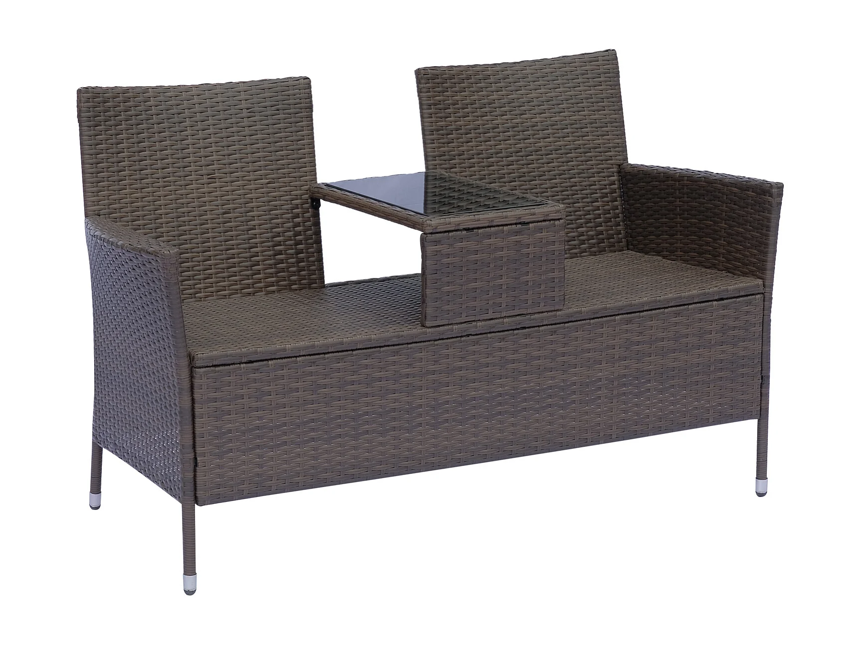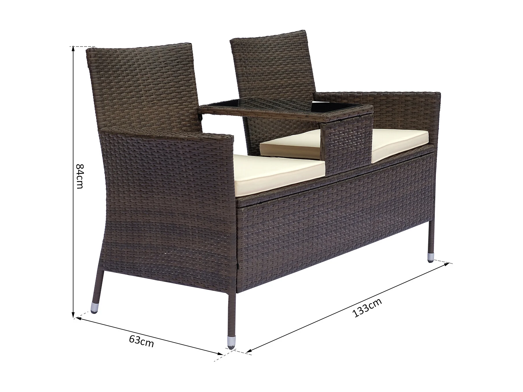 Banc de jardin design contemporain 133L x 63l x 84H cm banc double chaise avec coussins assise + tablette intégrée résine tressée chocolat polyester crème