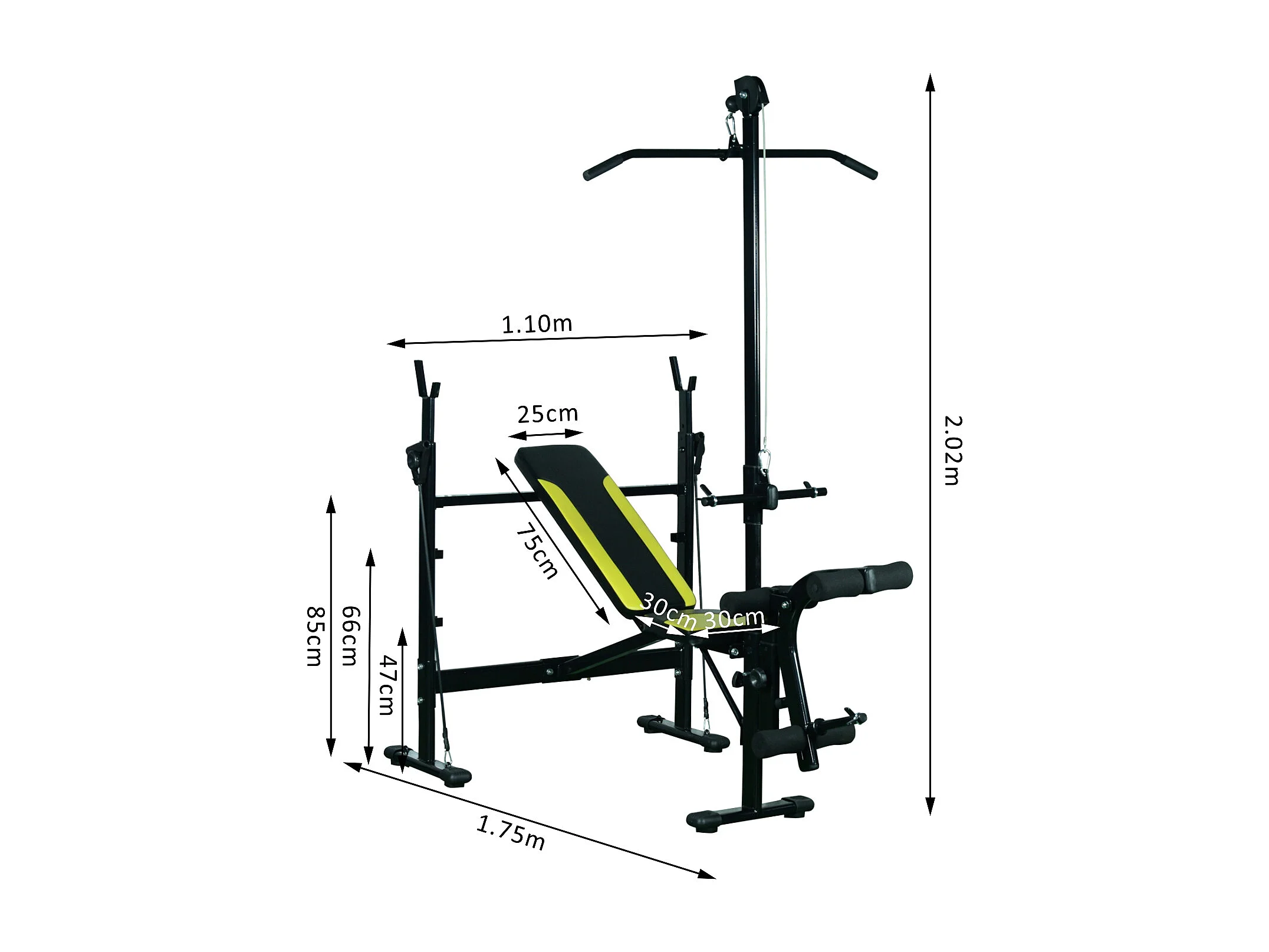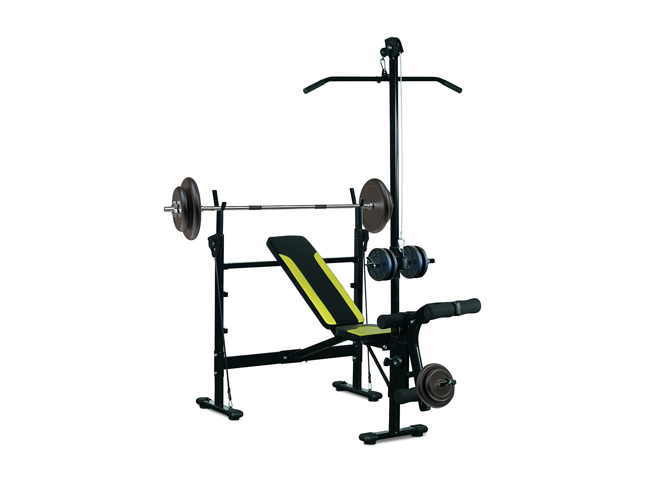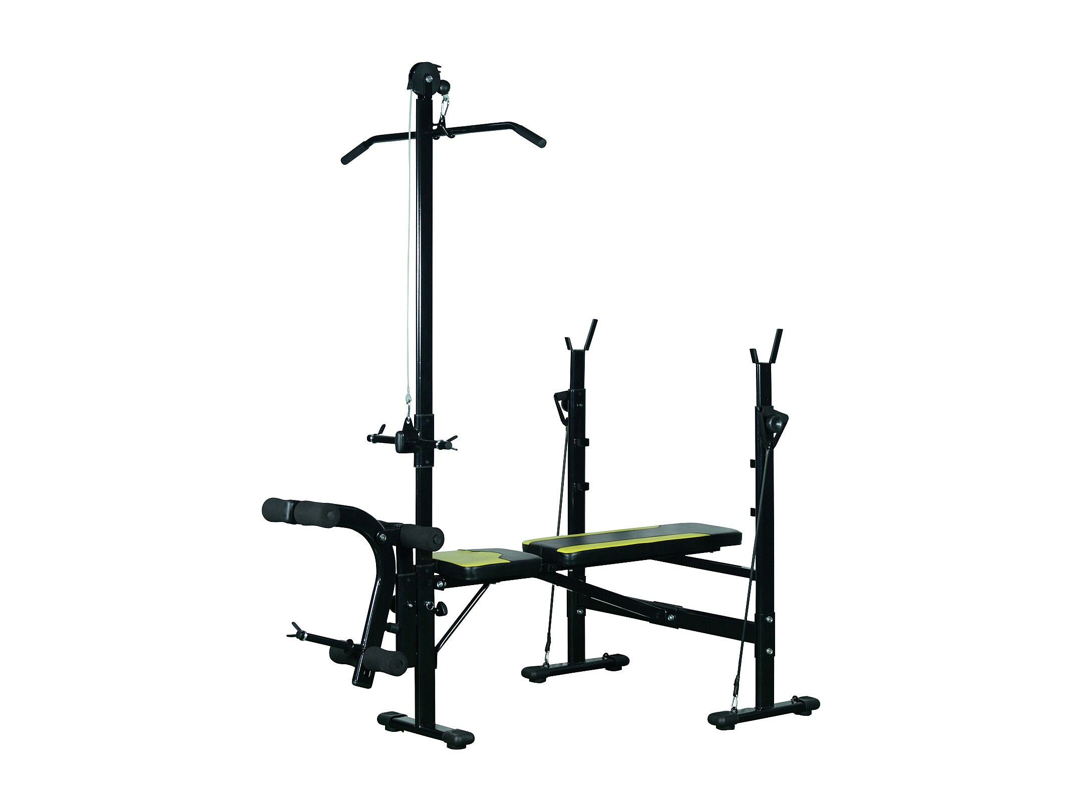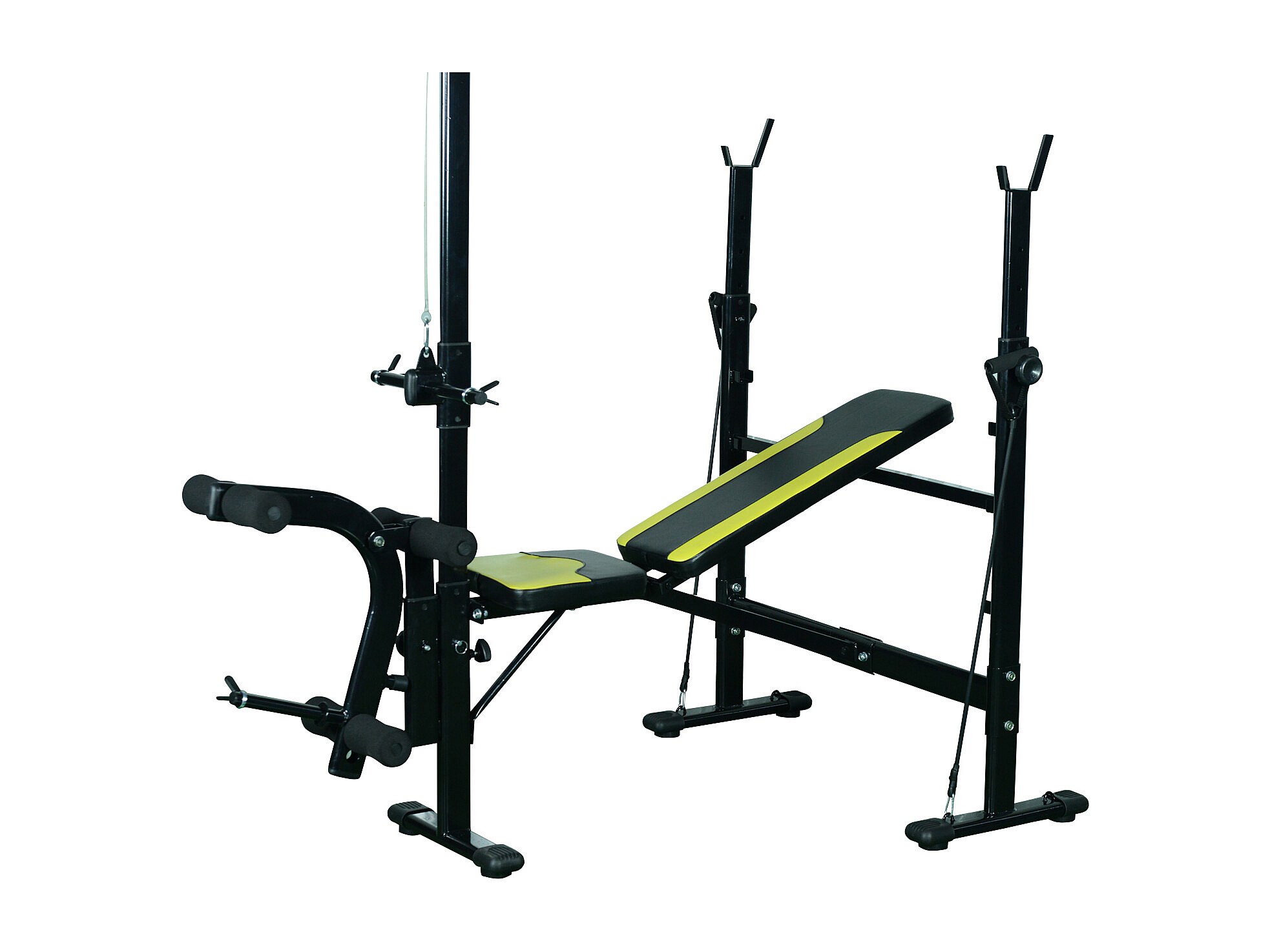 Banc de musculation Fitness entrainement complet dossier réglable cordes traction curler supports barre et haltères noir et jaune