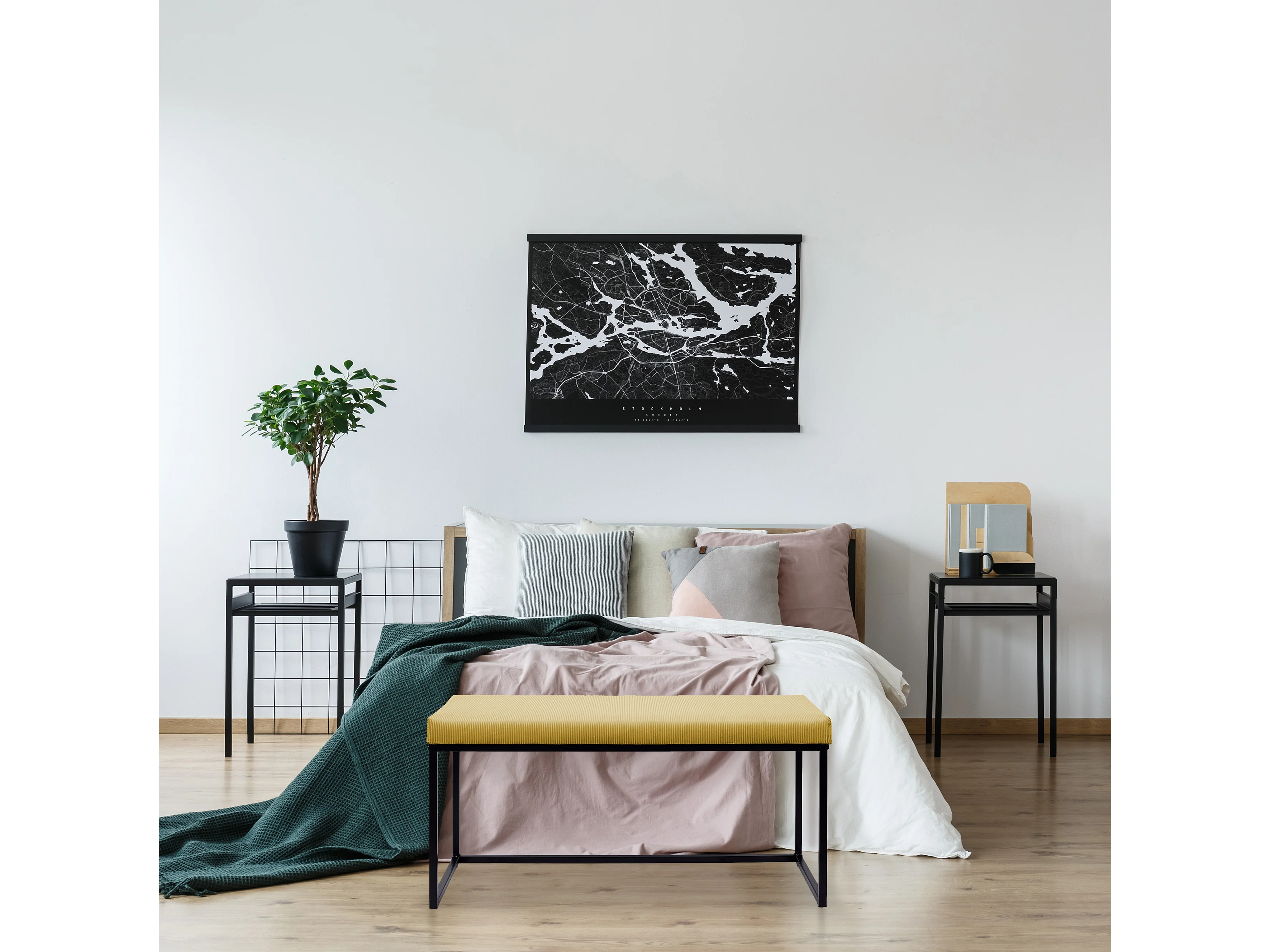 Banc design en tissu et pieds en métal noir Madrida-Couleur Jaune moutarde