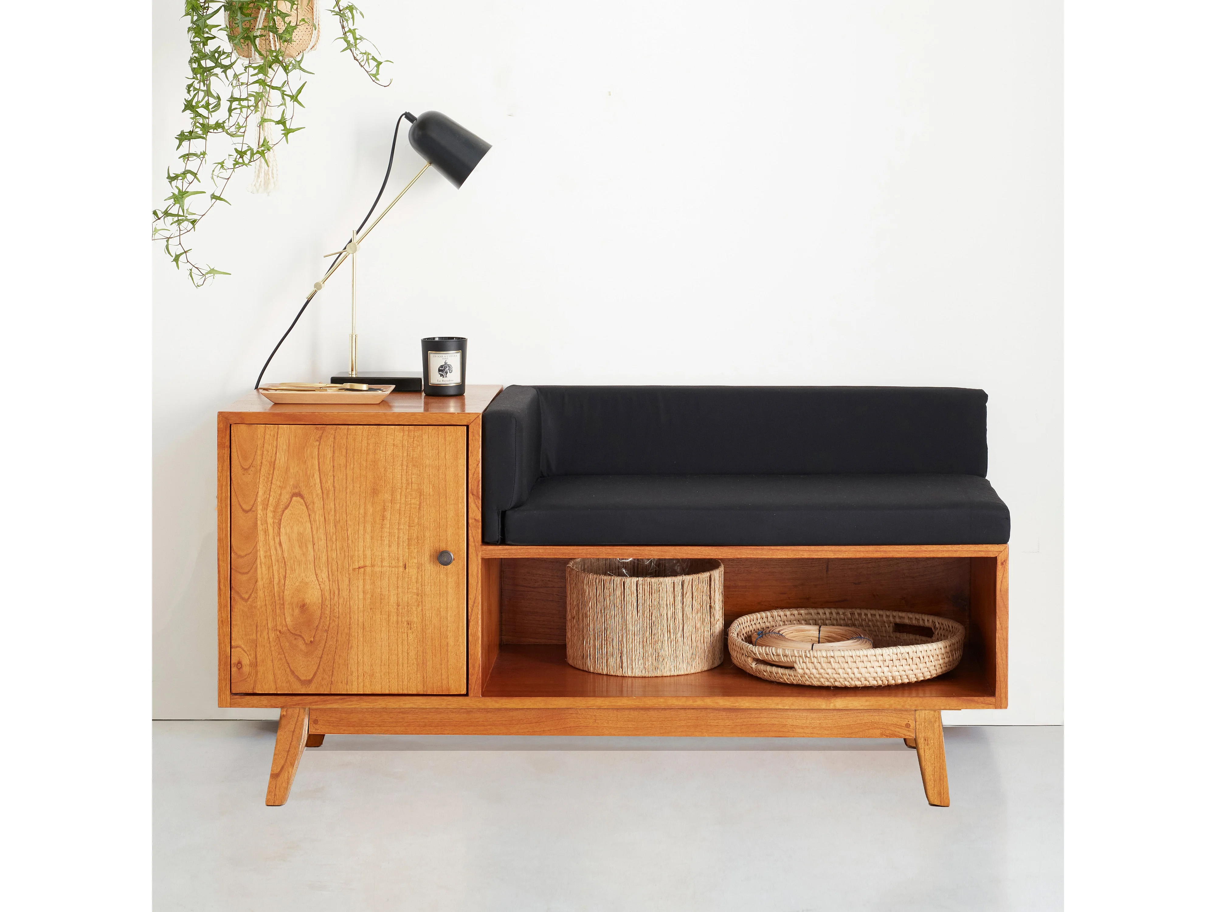 Banc en mindi massif avec coussins noirs