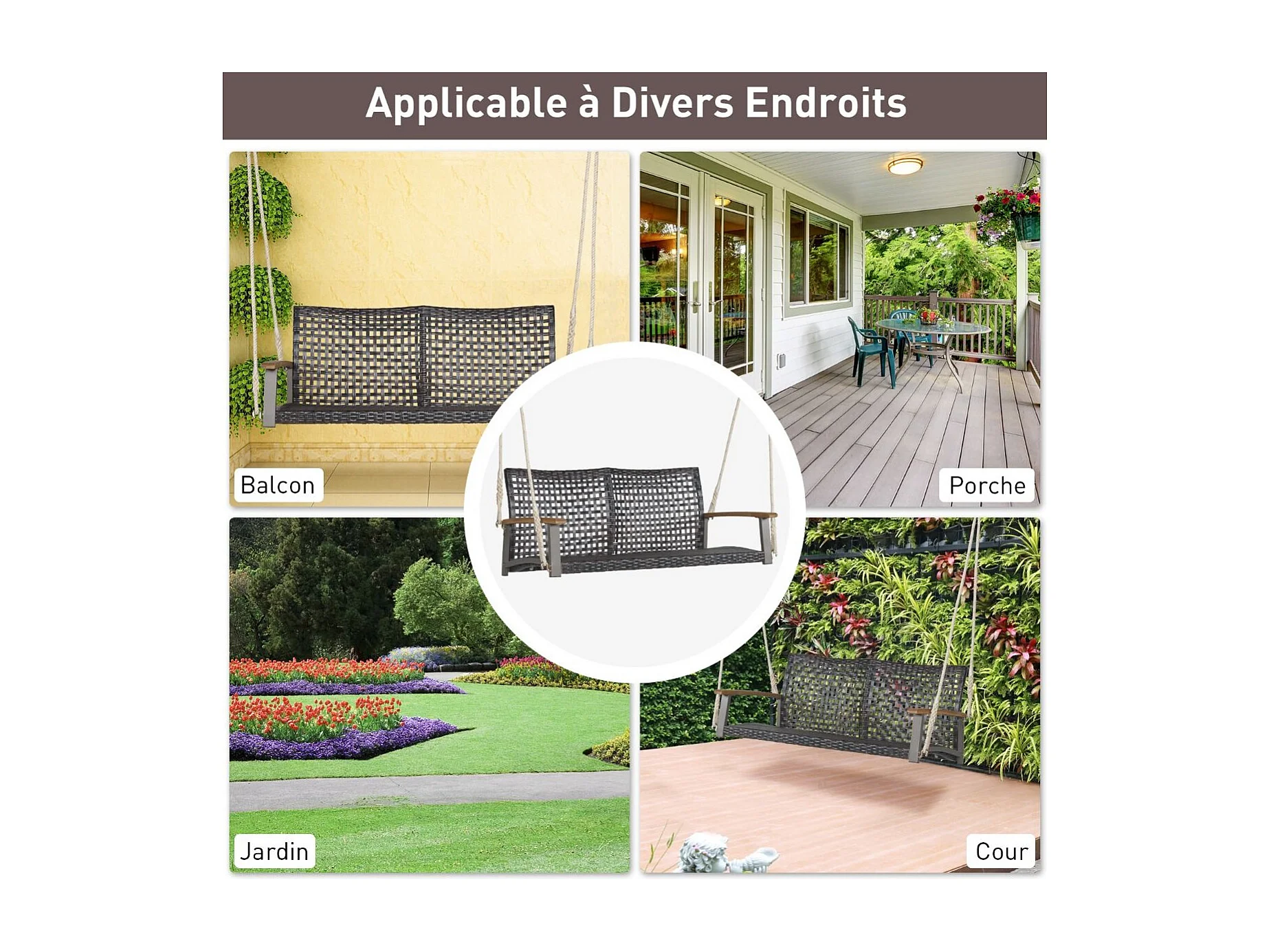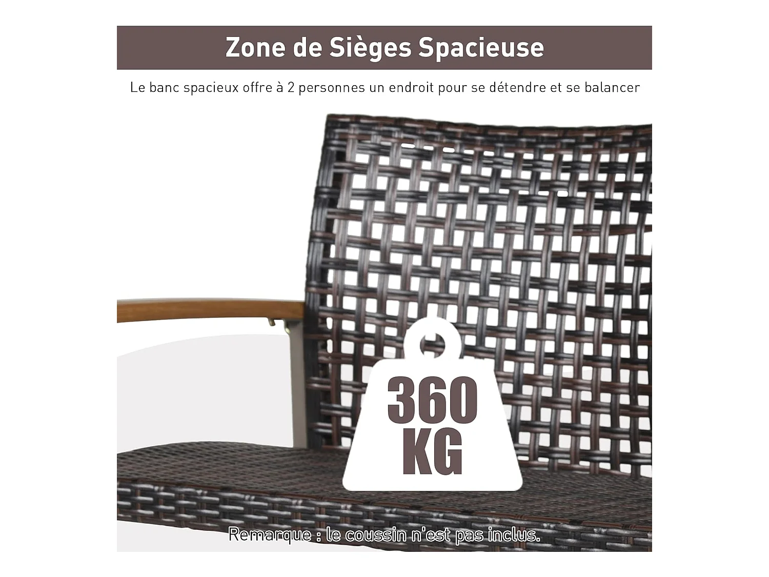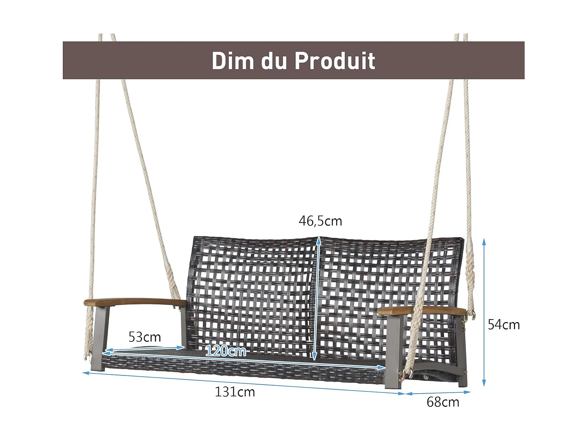 Banc Suspendu 2 Sièges, Balançoire de Jardin à Suspendre, Fabriquer en Plastique PE, Dossier Incurvé et Accoudoirs en Bois d'Acacia, Capacité Jusqu’à 360 kg