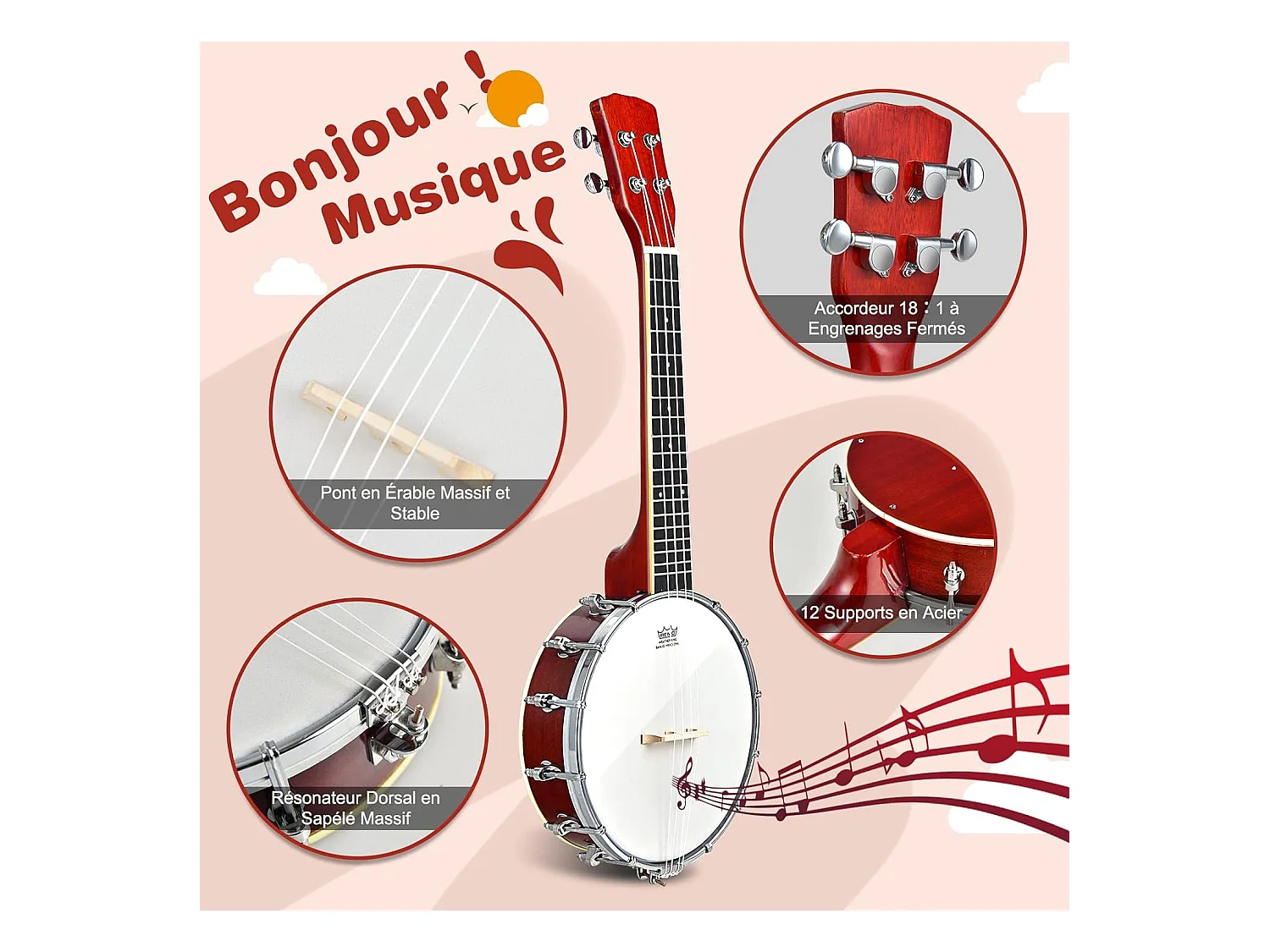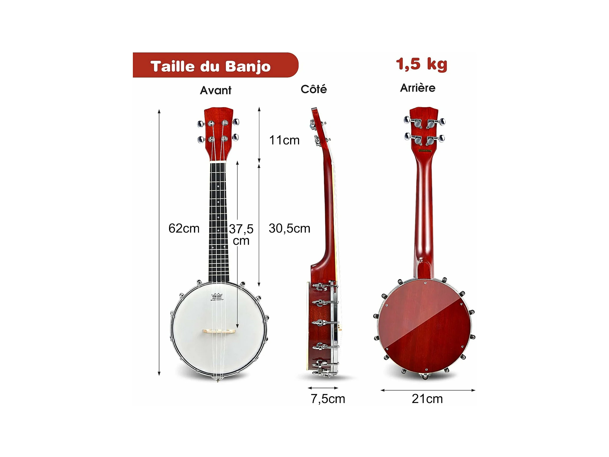 Banjo 4 cordes 24 pouces remo peau, 61,5 x 120 x 7,3 cm