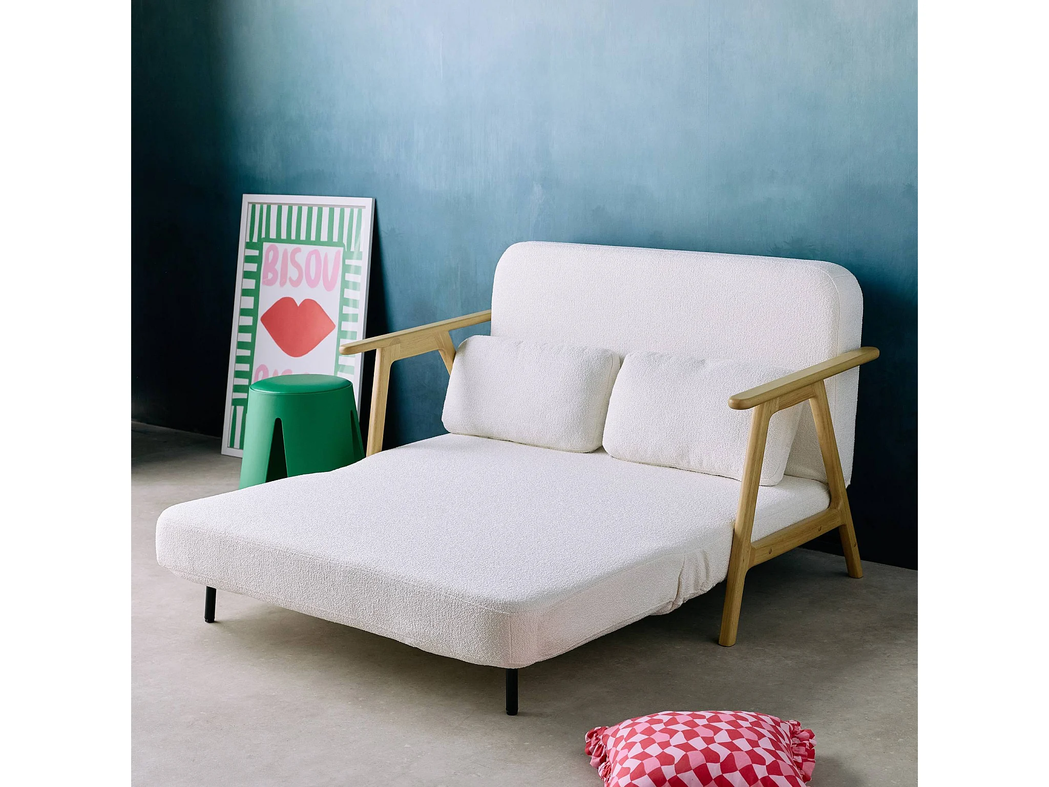 Banquette canapé convertible 2 places bois d'hévéa et bouclette texturée crème L 133 x P 81 x 84cm - Sven