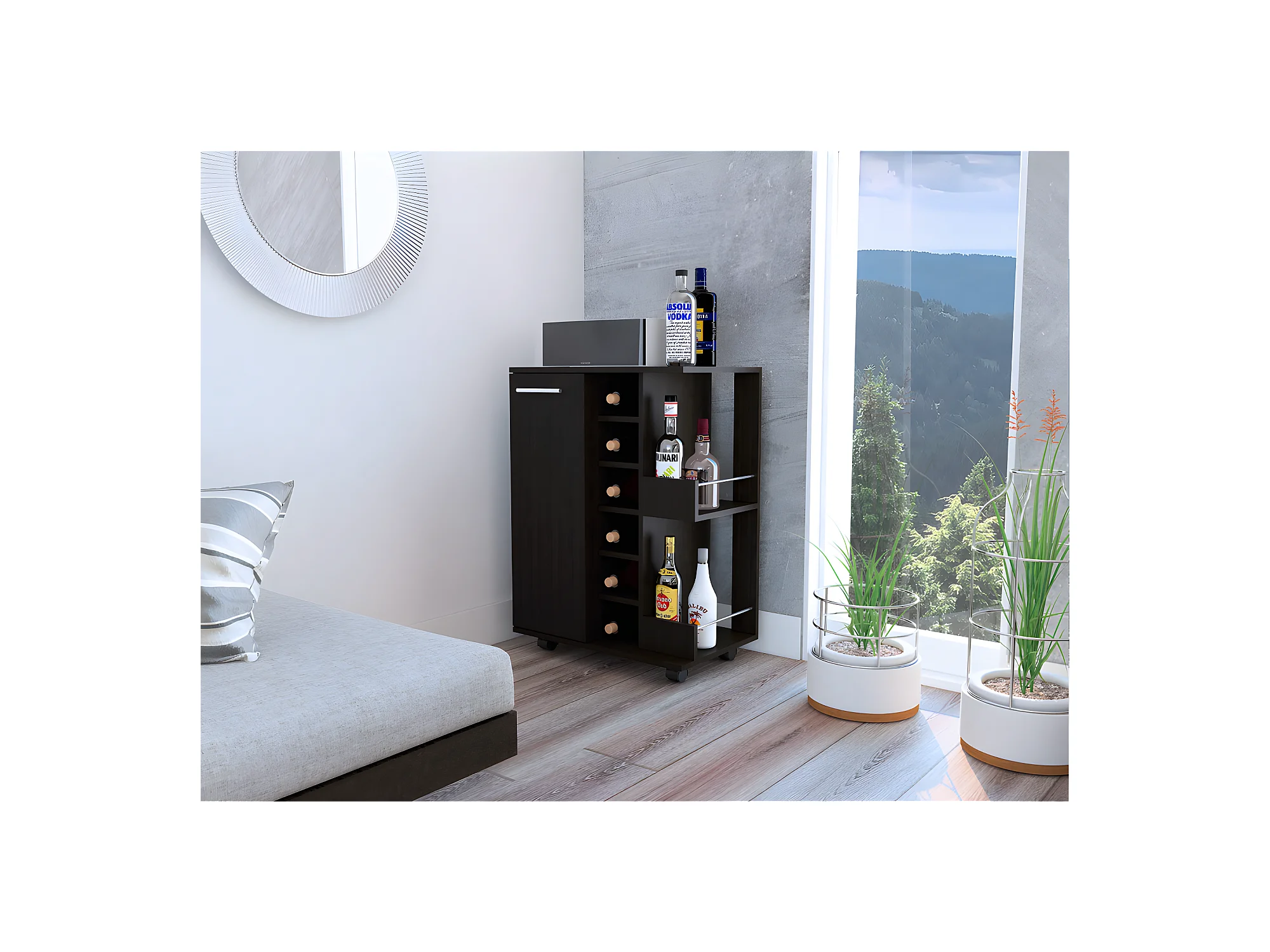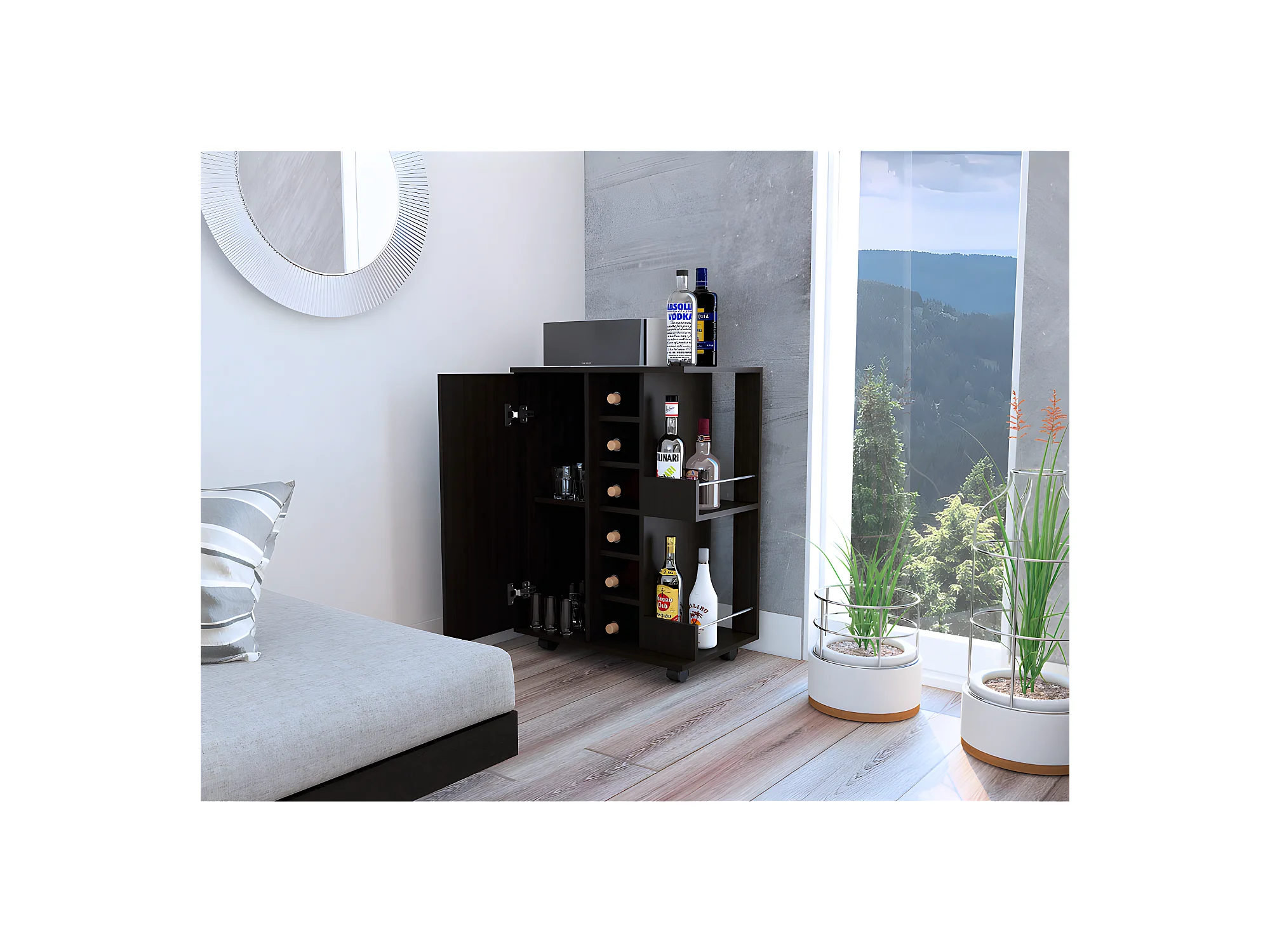 Meuble bar d'angle en mélamine Syrah avec quatre étagères, huit casiers à bouteilles et porte-verre , Noir 180.6 X 46,9 X 46.9 cm