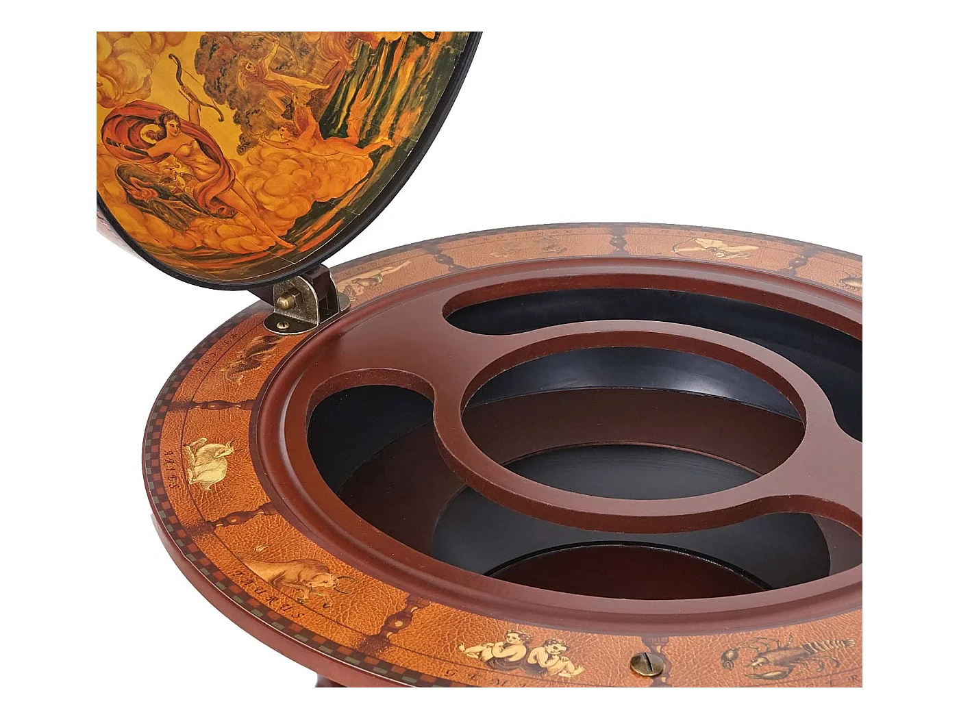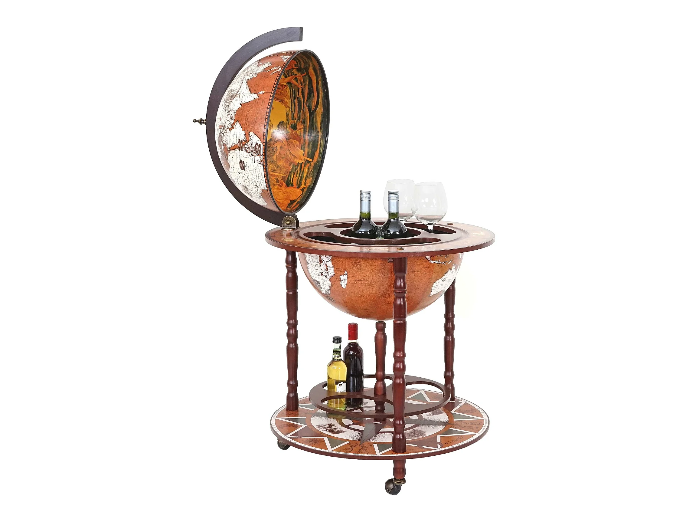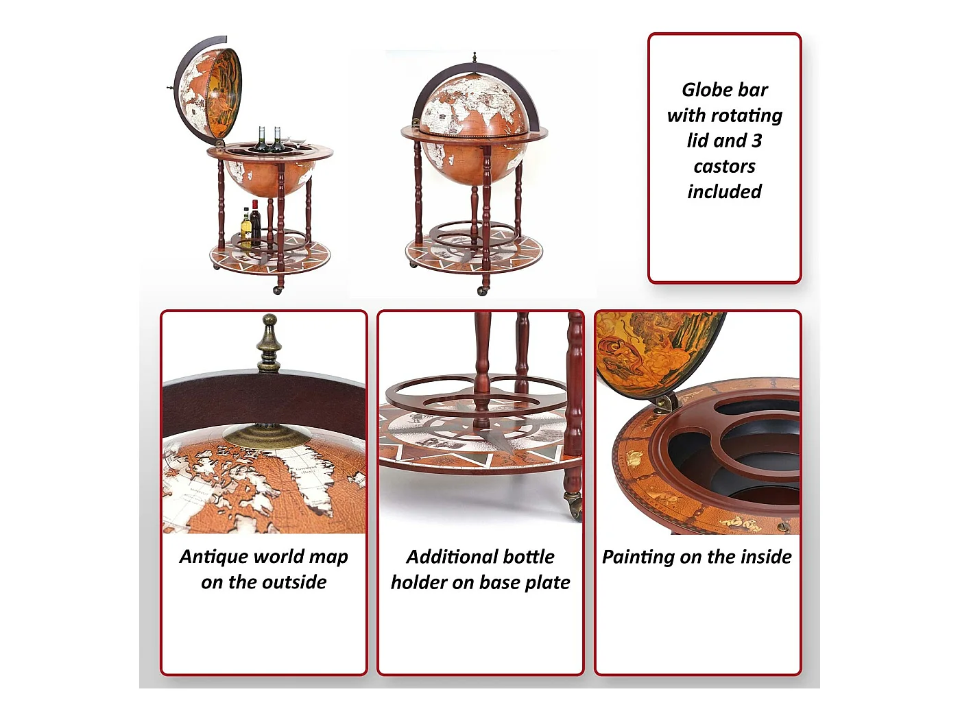 Bar de salon HWC-D86, minibar, étagère de vin, globe terrestre Ø 45cm, roulant, bois d'eucalyptus