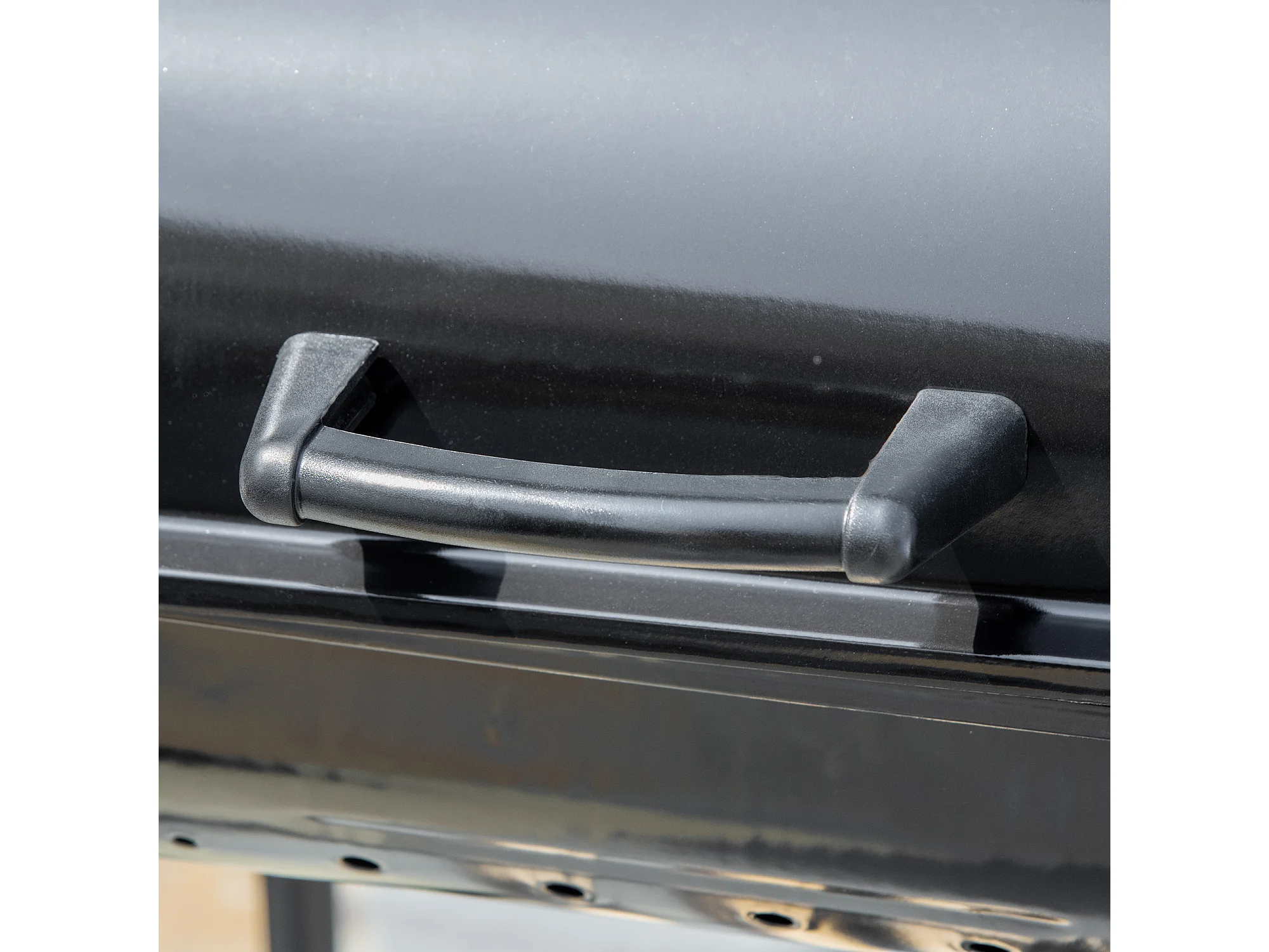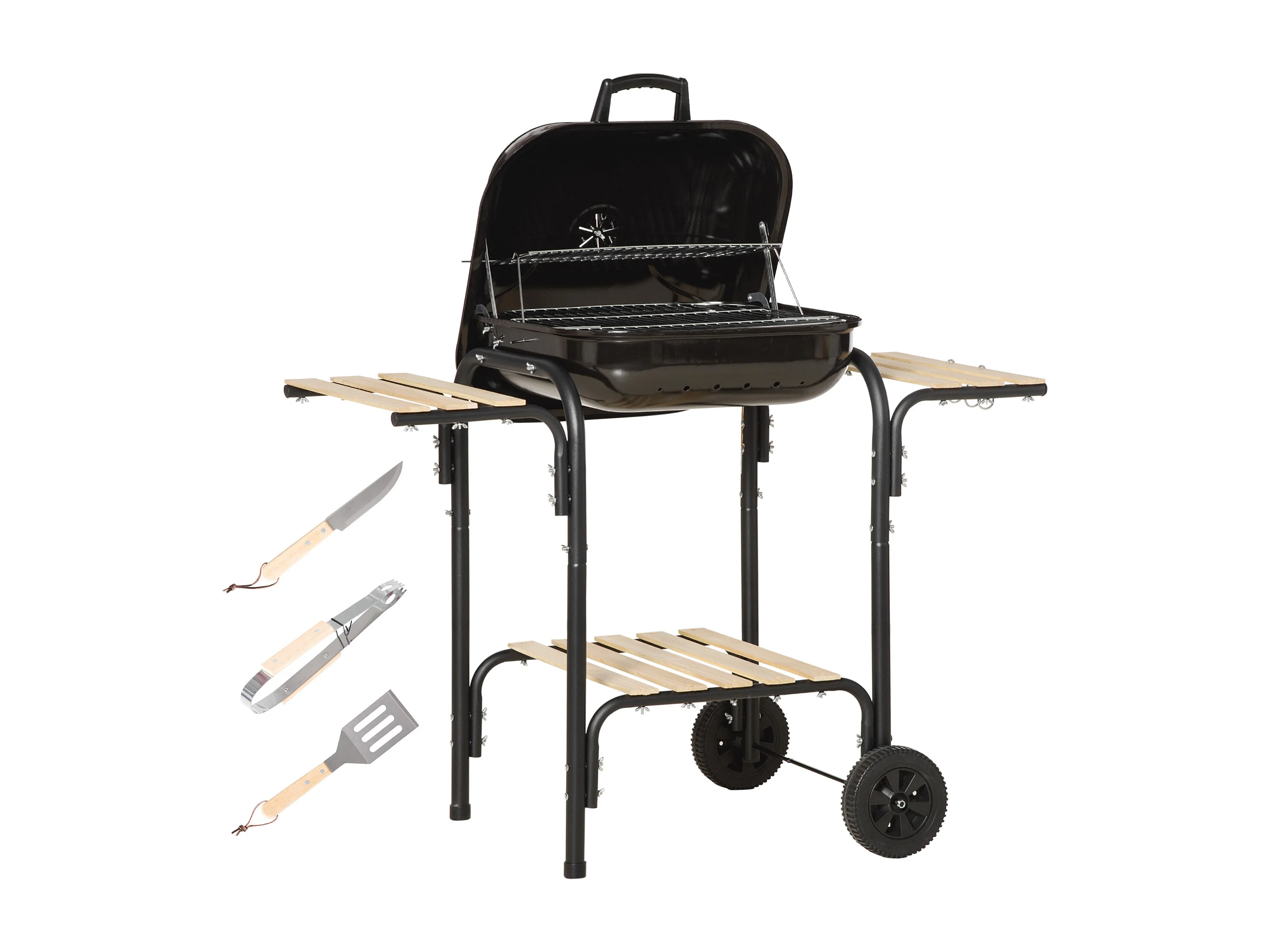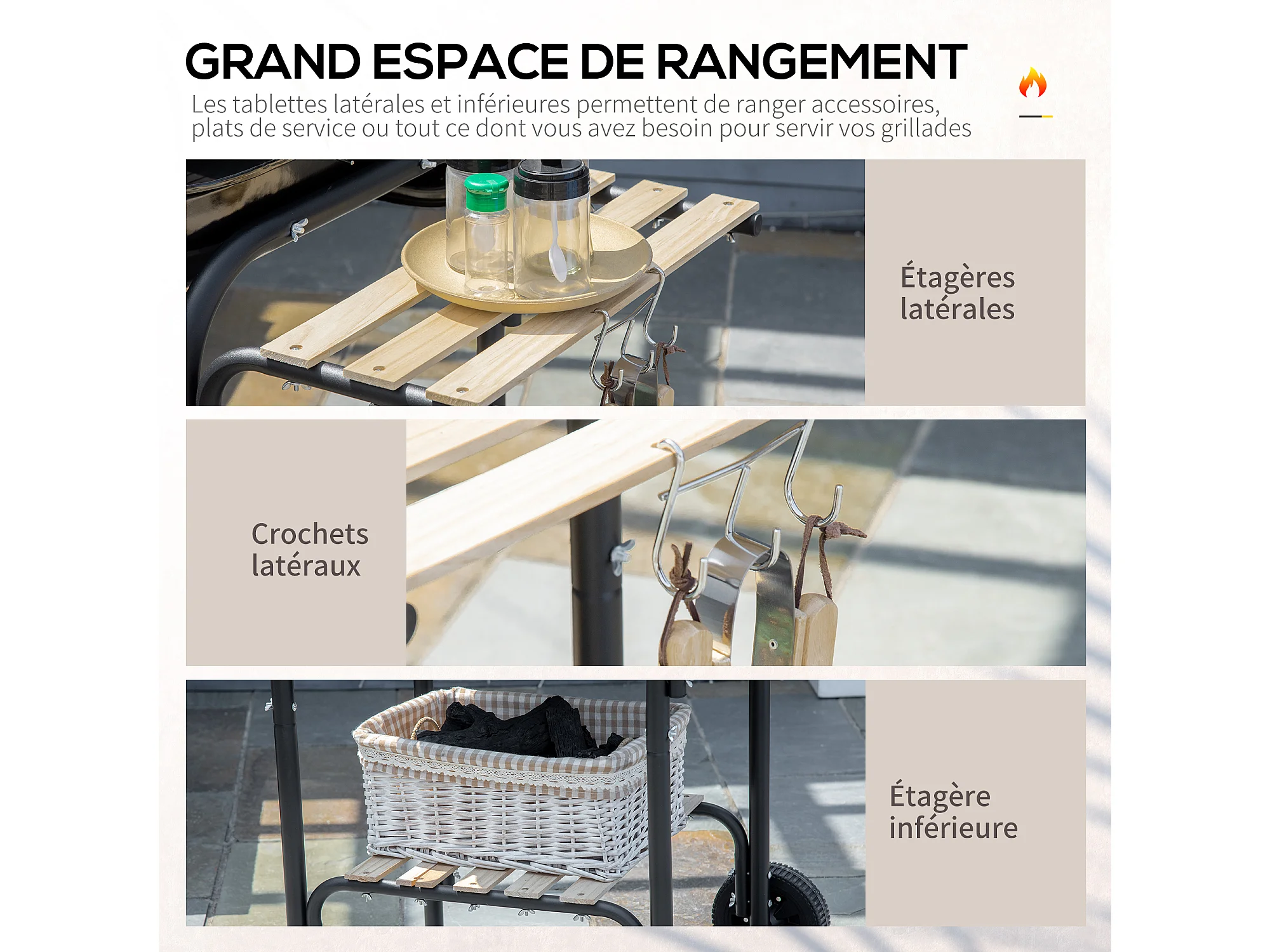 Barbecue à charbon - BBQ grill sur pied avec couvercle, roulettes - 3 étagères, 3 crochets, 3 ustensiles, 2 grilles, cuve charbon amovible - bois acier émaillé noir