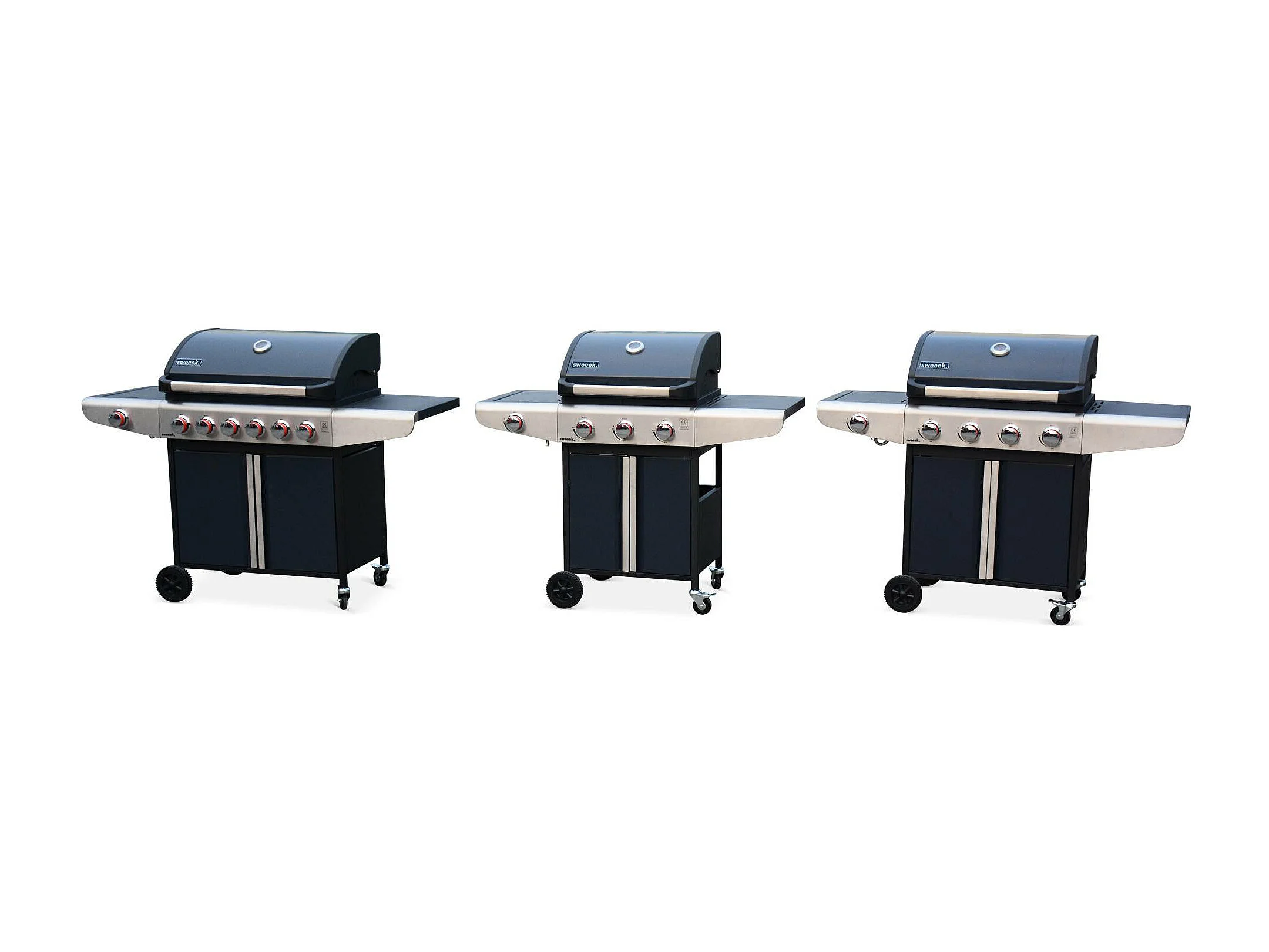 Barbecue au gaz - Bazin 3 Gris anthracite - Cuisine extérieure 3 brûleurs + 1 feu latéral avec tablettes et thermomètre. rangement. roues