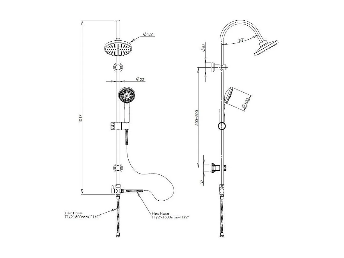 Barre De Douche Avec Pomme De Douche Fixe Et Pommeau Manuel + Déviateur Modèle “M”