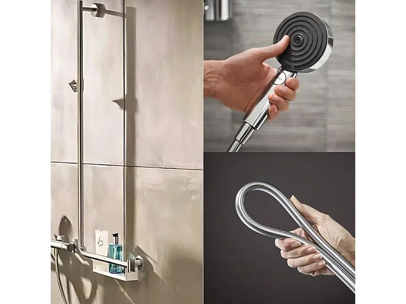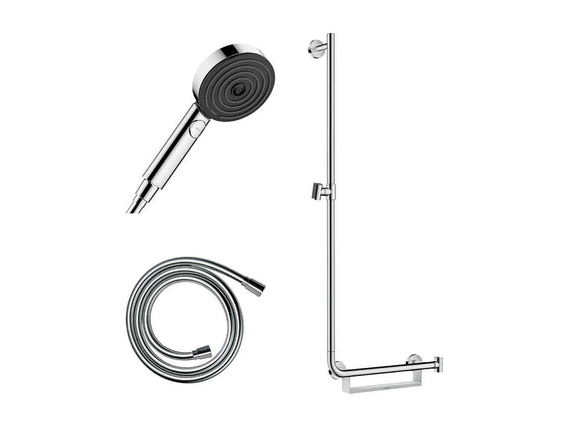 Barre de douche PMR HANSGROHE Unica 110 avec poignée à droite Chromé + Pommeau de douche Pulsify 3 jets + flexible Isiflex 160cm