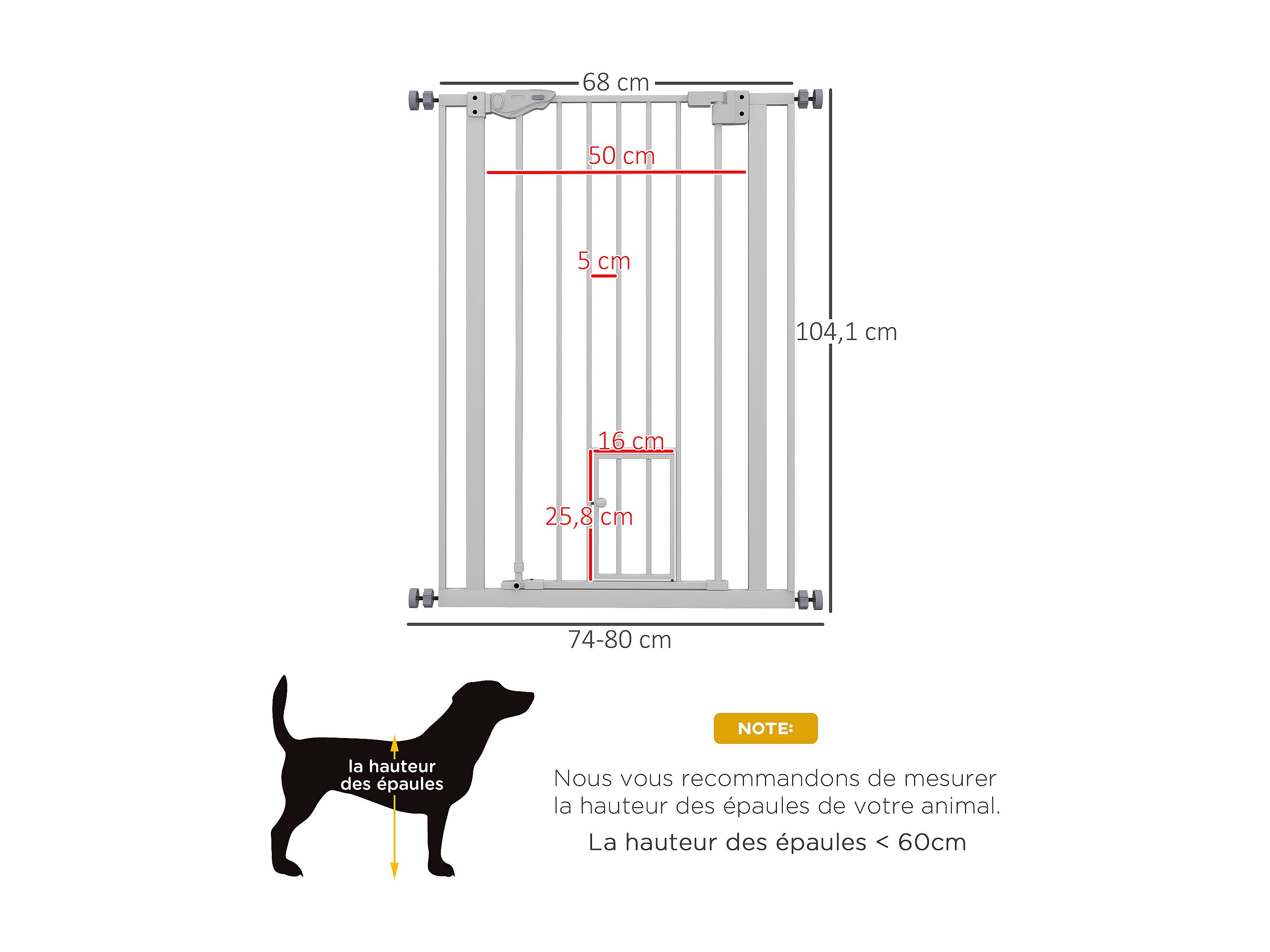 Barrière de sécurité animaux - longueur réglable dim. 74-80 cm - porte double verrouillage, ouverture double sens, petite porte -sans perçage - acier plastique