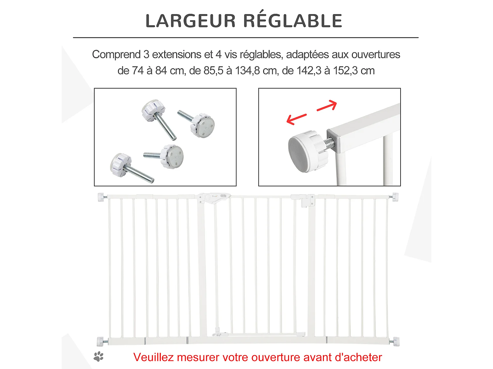Barrière de sécurité animaux - longueur réglable dim. 74-97,5 cm - porte double verrouillage, ouverture double sens -sans perçage - acier plastique blanc