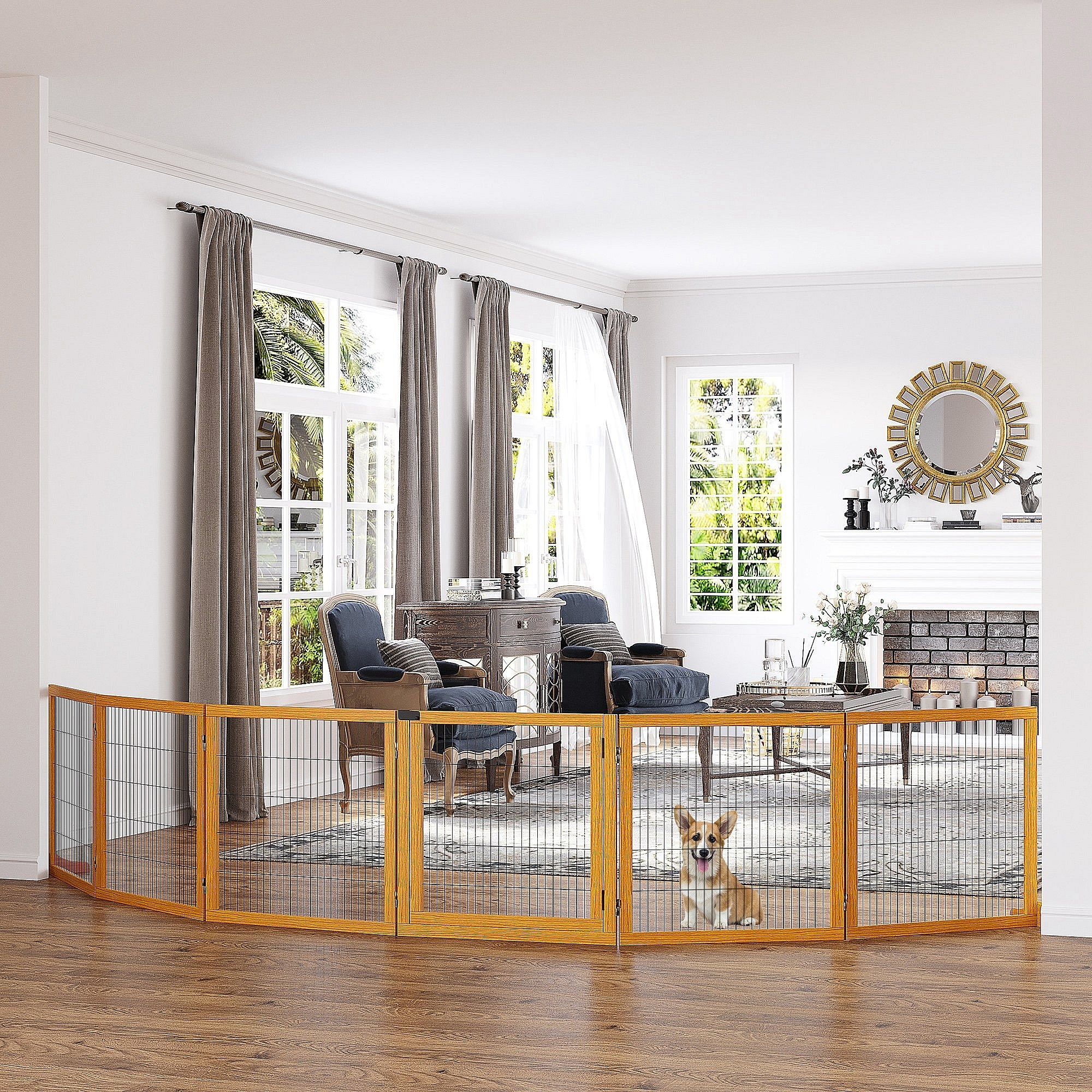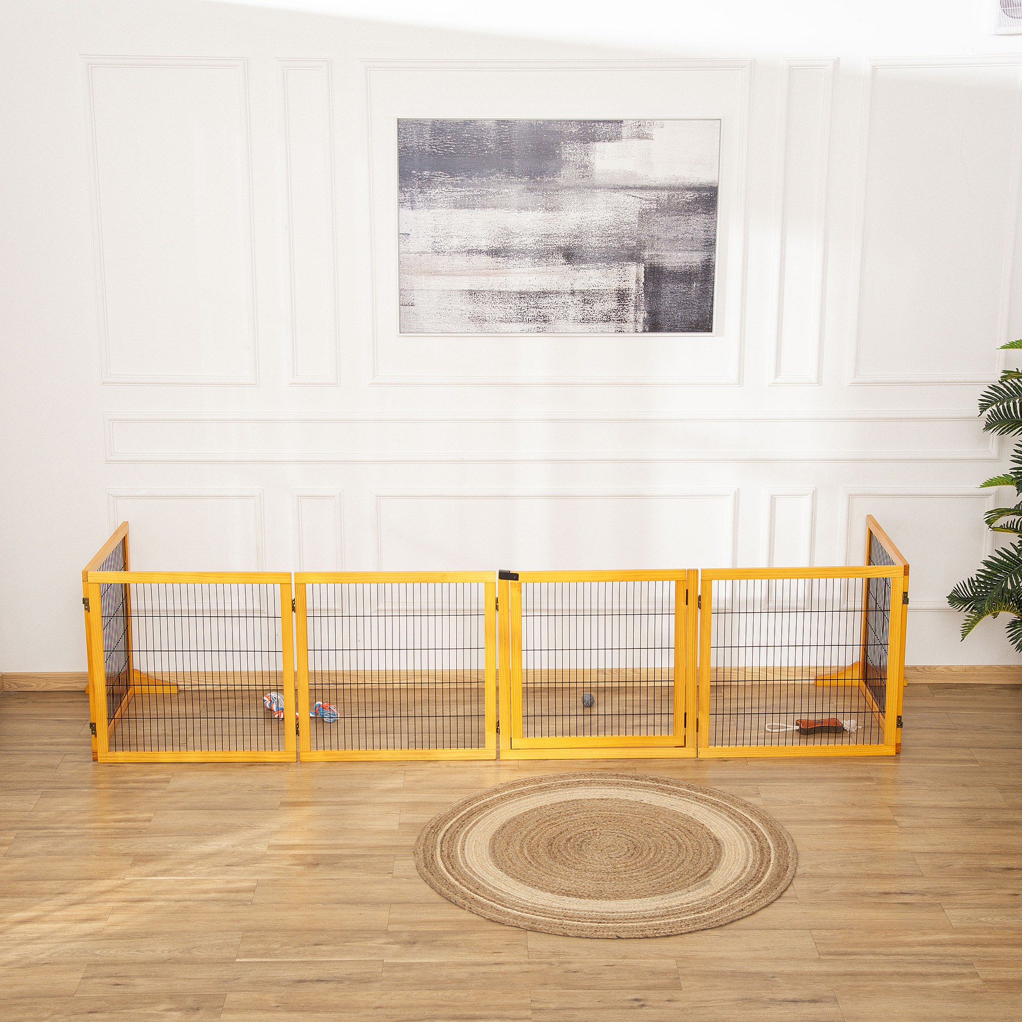 Barrière de sécurité parc enclos chien modulable pliable porte verrouillable intégrée 5 panneaux grillage acier noir bois de pin verni