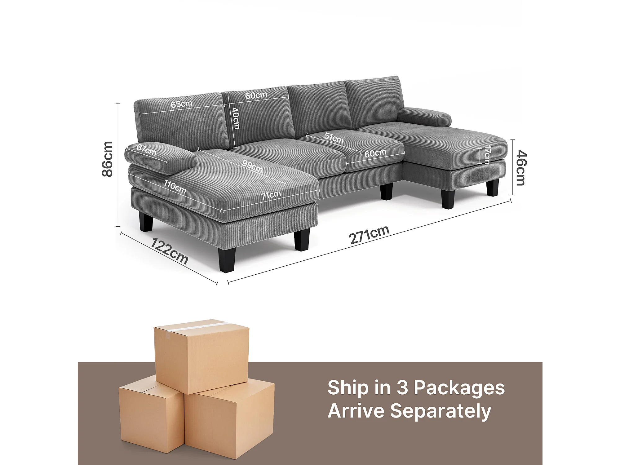 Bealife Canapé d’angle en forme de U avec 2 chaises longues, canapé convertible en velours côtelé, salon moderne spacieux pour grandes réunions de famille - Gris