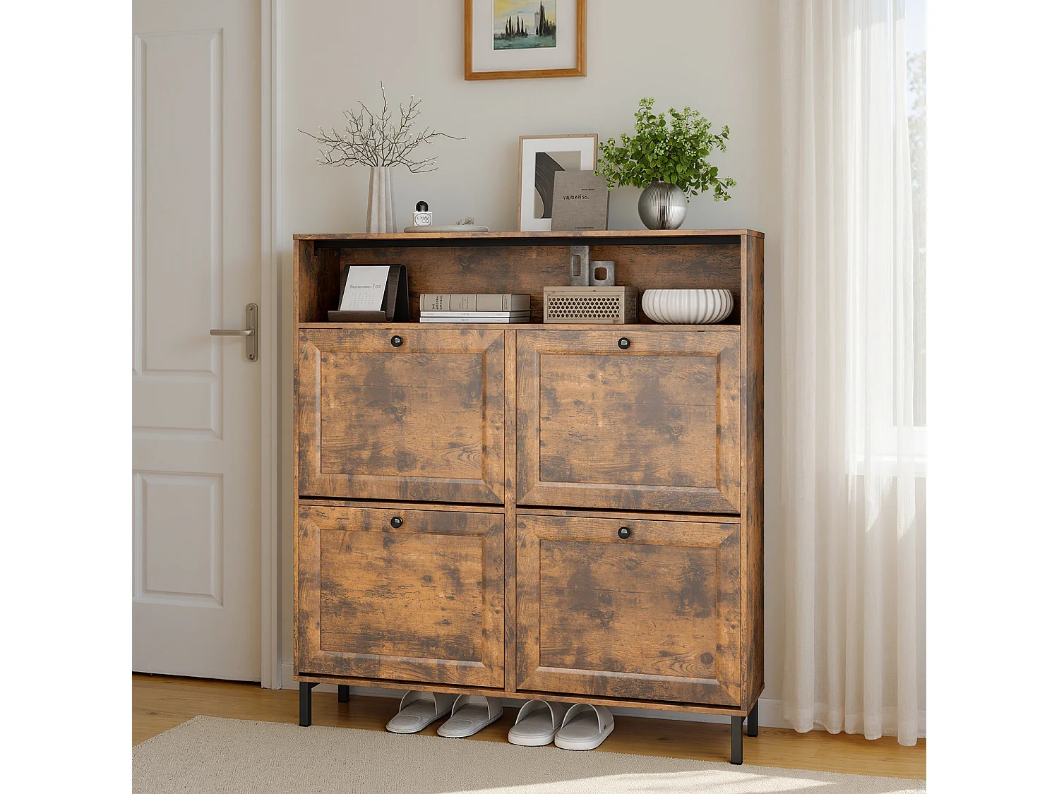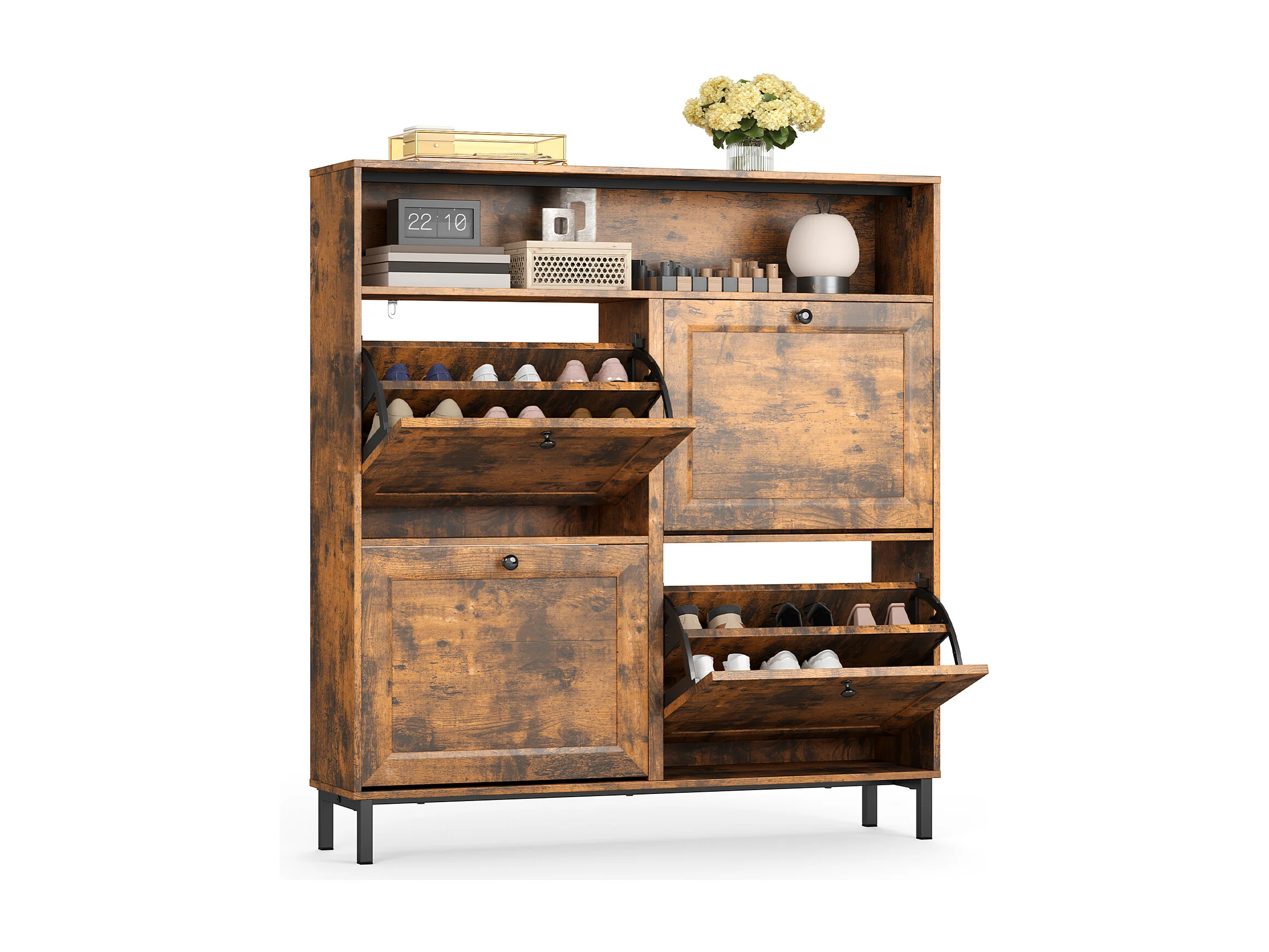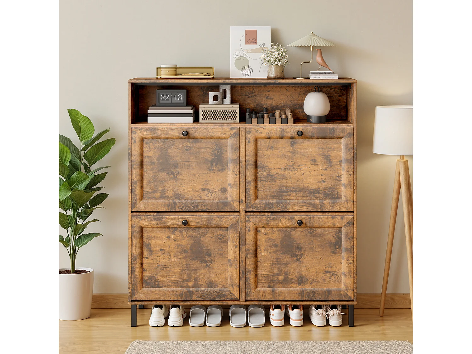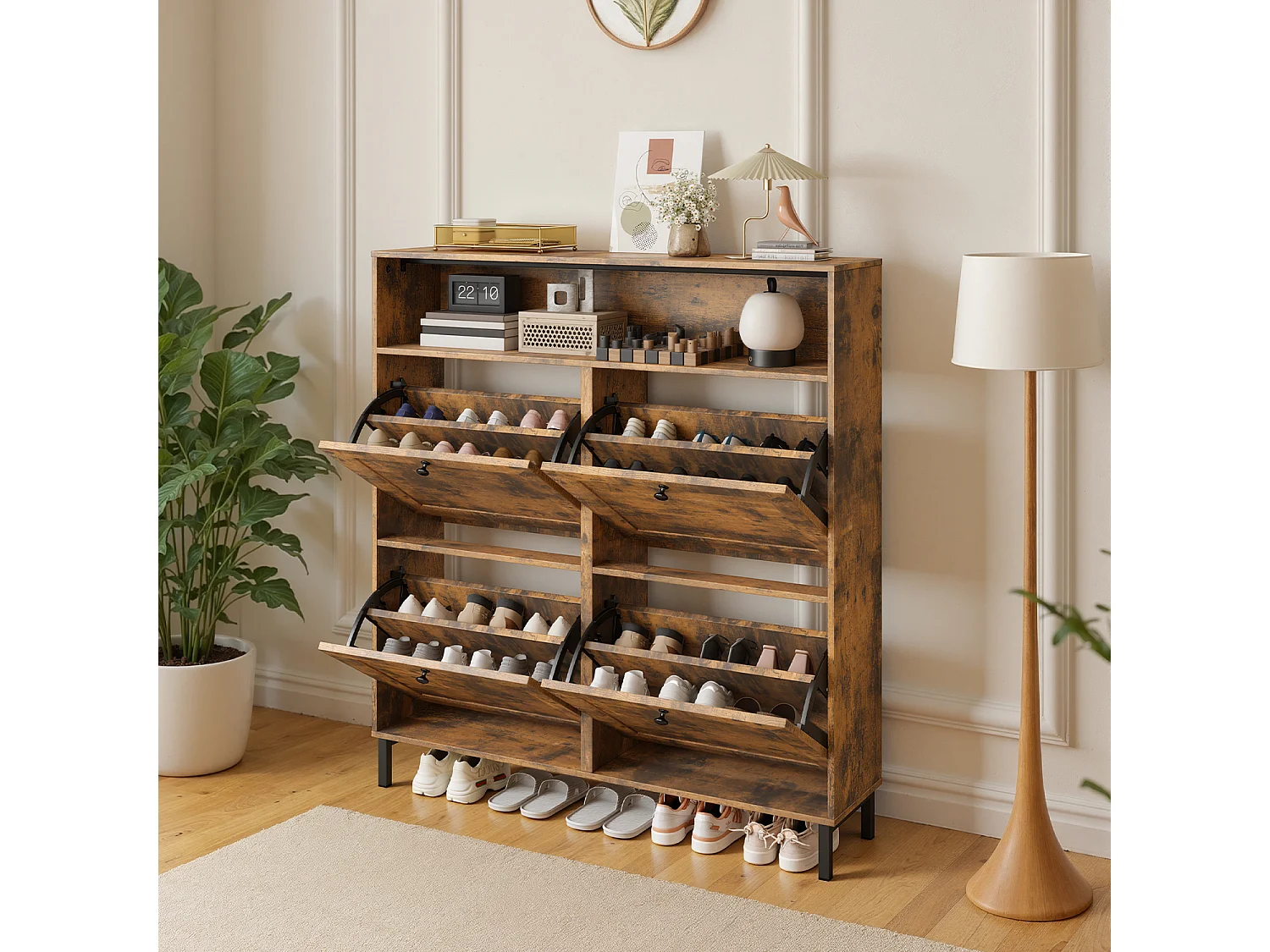 Bealife Meuble chaussures avec 4 abattants et 1 niche, 100x24x108 cm, Marron – Étagères réglables, capacité de rangement importante pour toutes vos chaussures.