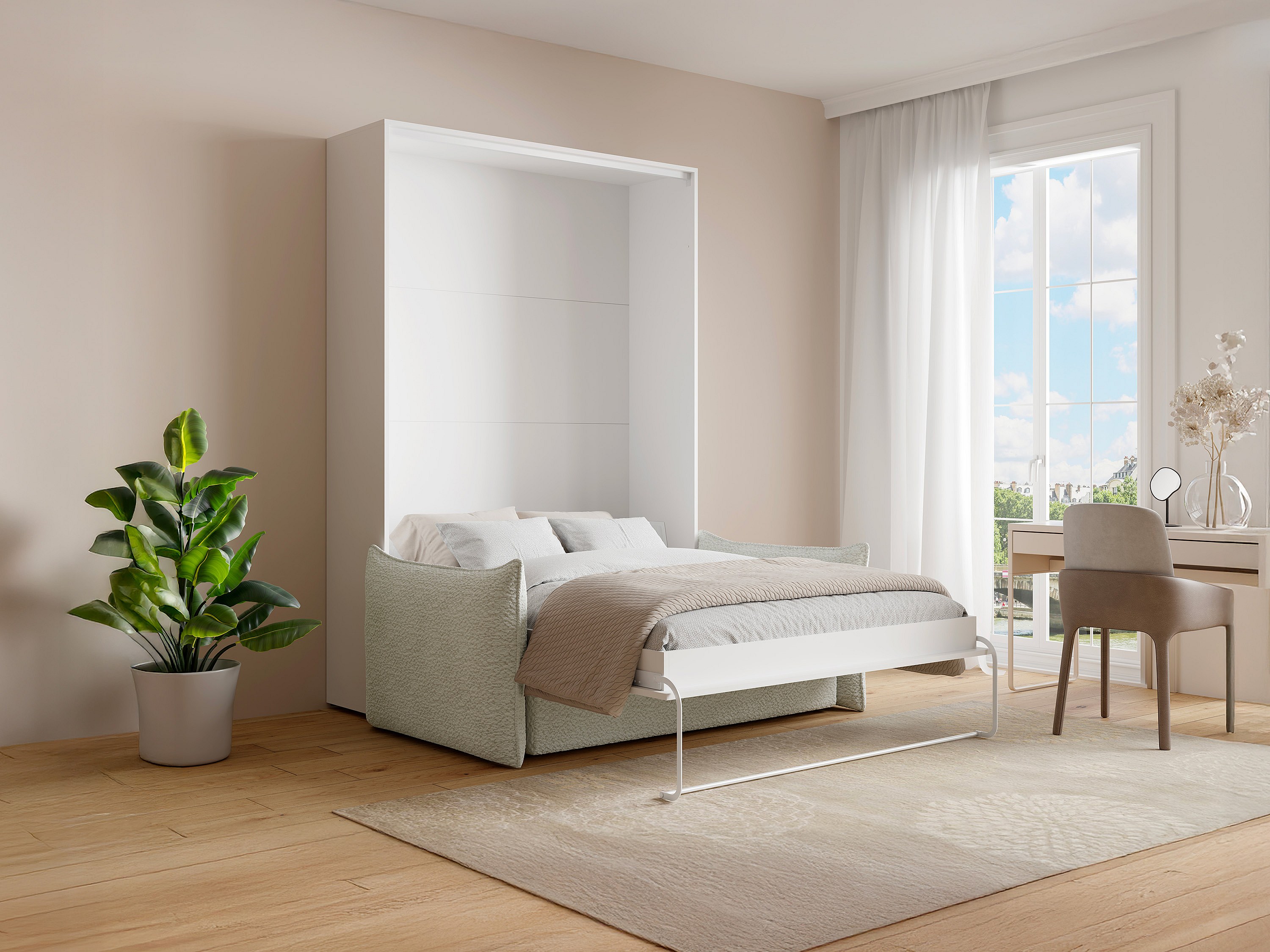 Lit escamotable 140 x 200 cm - Ouverture verticale manuelle - Blanc + Canapé - BEGANIO