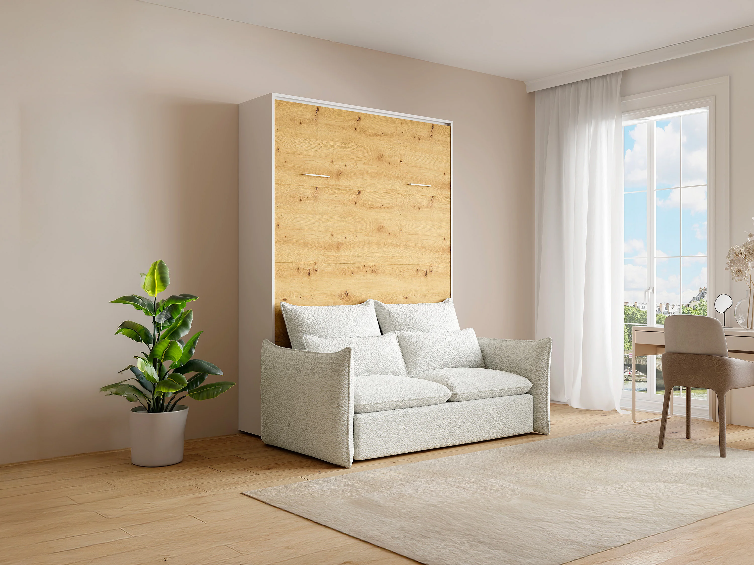 Lit escamotable 140 x 200 cm - Ouverture verticale manuelle - Coloris : Naturel et blanc + Canapé - BEGANIO