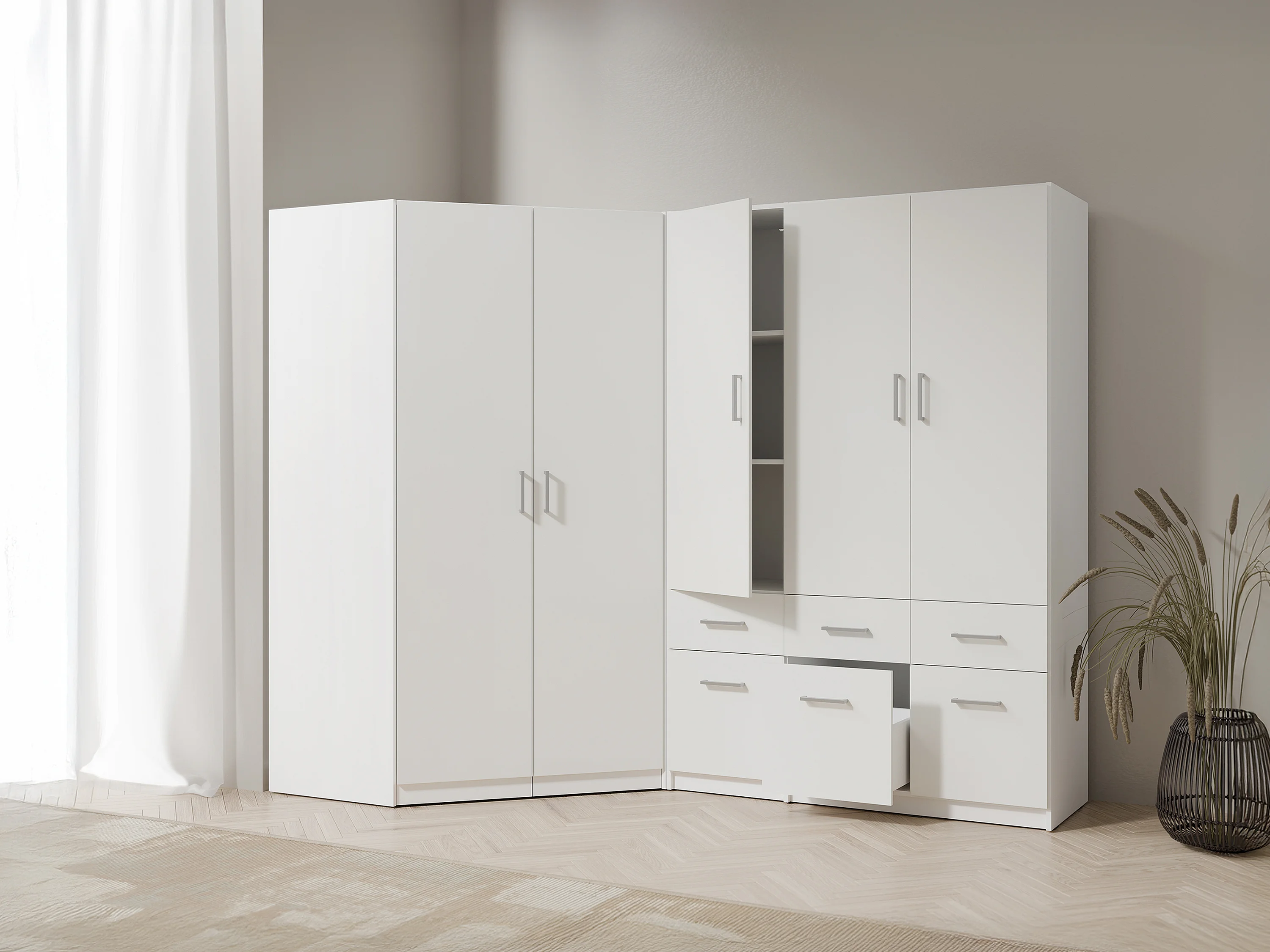 Armoire d'angle 5 portes et 6 tiroirs - L254 cm - Blanc - BELOMY