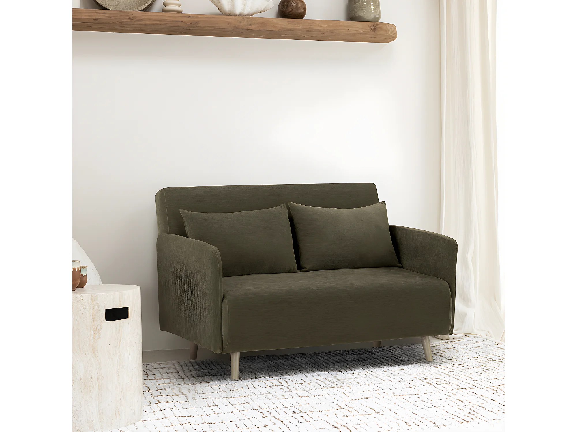 Belushi - Canapé convertible 2 places en tissu chenille L120cm - Vert kaki