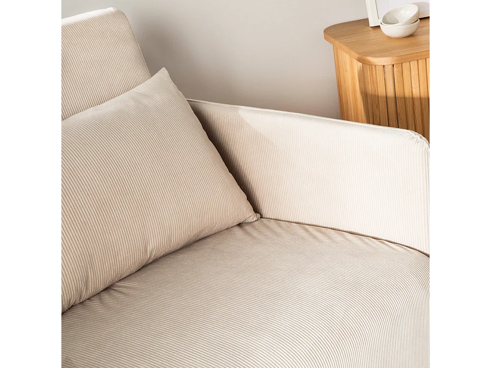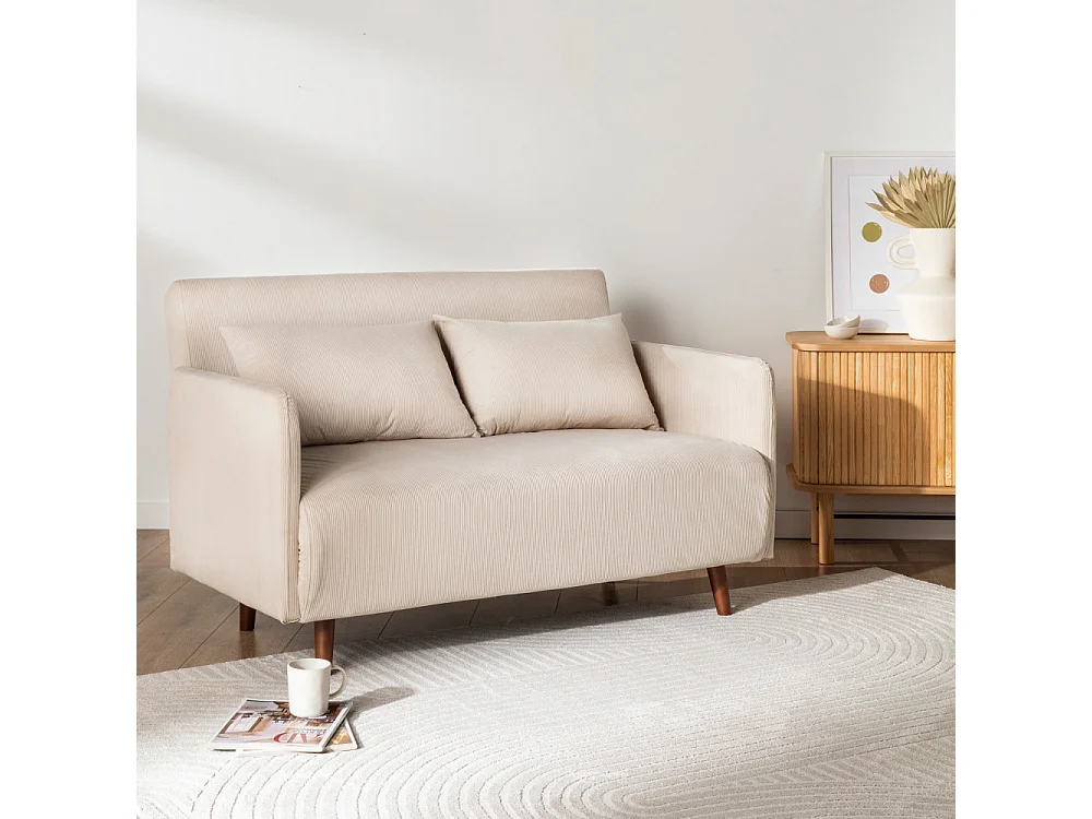Belushi - Canapé convertible 2 places en velours côtelé pieds bois foncé - Beige